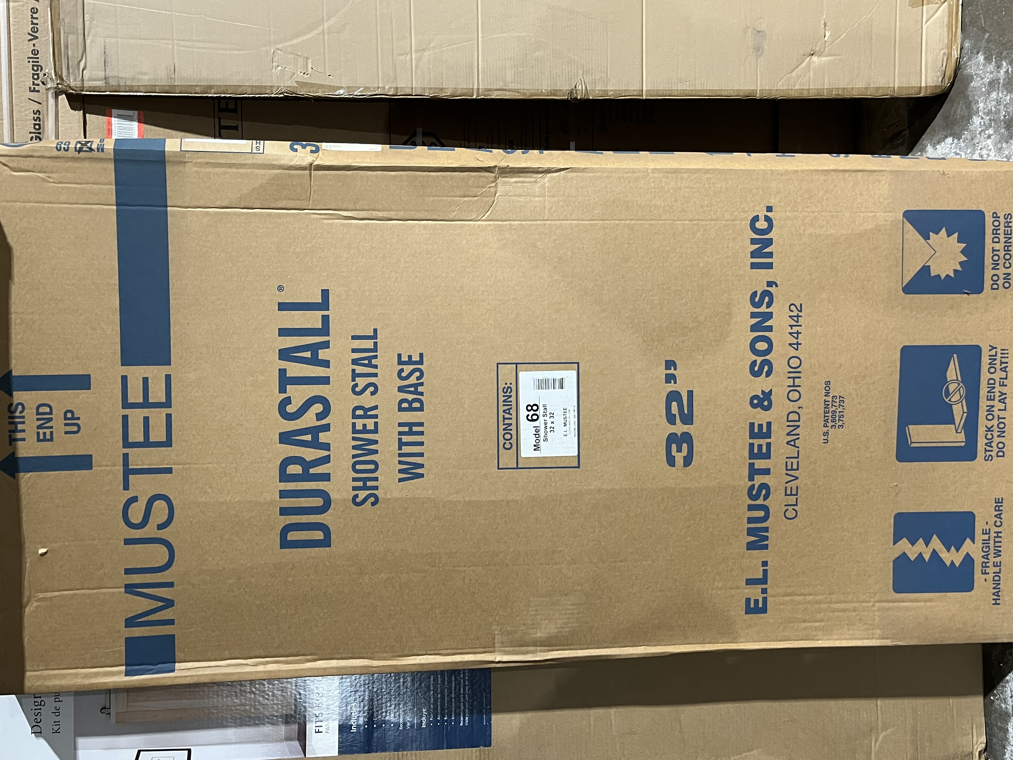 a knock-down shower and comes in a box. The box can be easily taken through doorways or up and down stairs. The 68 Durastall must be assembled on sight and fastened together. Consists of three, white, high-gloss thermoplastic walls, molded top frame, rigid plastic front supports, slip-resistant 32 in. x 32 in. base, one-piece wrap-around railing with built-in soap dish and container.