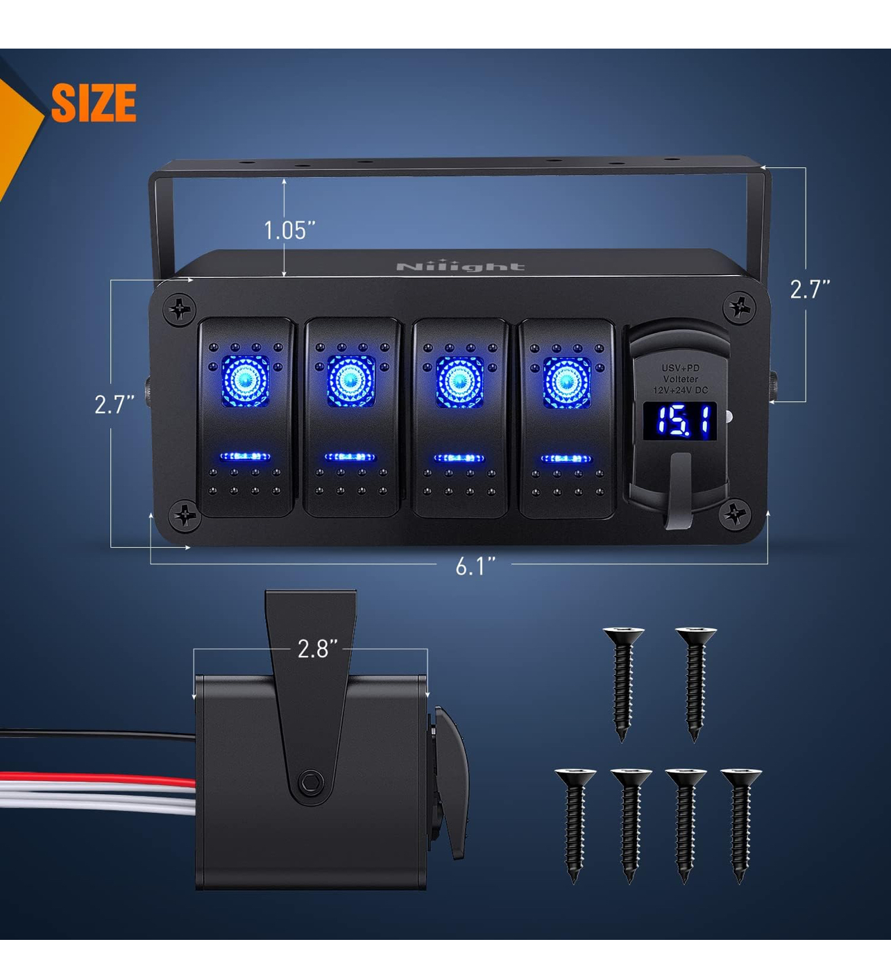 Nilight 4 Gang Rocker Switch Box 12V SPST ON Off Switch PD Type C and QC 3.0 USB Charger Voltmeter Waterproof Aluminum Rocker Switch Panel DIY Stickers for Boats Cars RVs Trucks