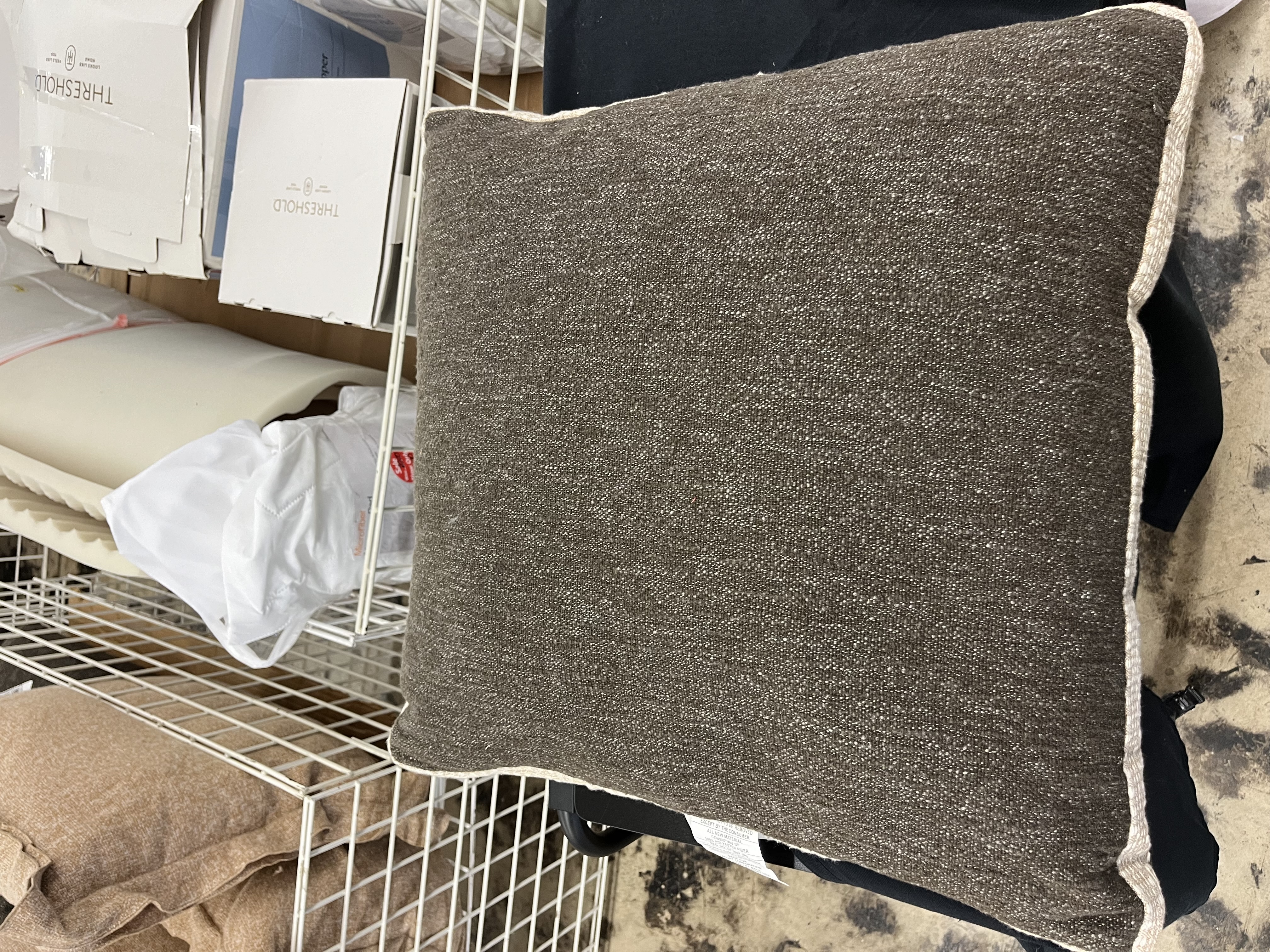 Add a cozy touch to your decor with this Oversized Boucle Square Throw Pillow from Threshold™ designed with Studio McGee. Boasting a square shape that allows for versatile placement on a bench, sofa or bed, this decorative pillow features a dark brown boucle surface elevated by a two-inch gusset adorned with a cream-color pattern. Featuring a cotton and polyester exterior and polyester fill, the oversized throw pillow brings ample comfort and style to your space. • Oversized square throw pillow with 2in gusset • Boucle surface and cream-color patterned gusset • Cotton and polyester exterior and soft polyester fill • Sewn-seam closure • Spot or wipe clean