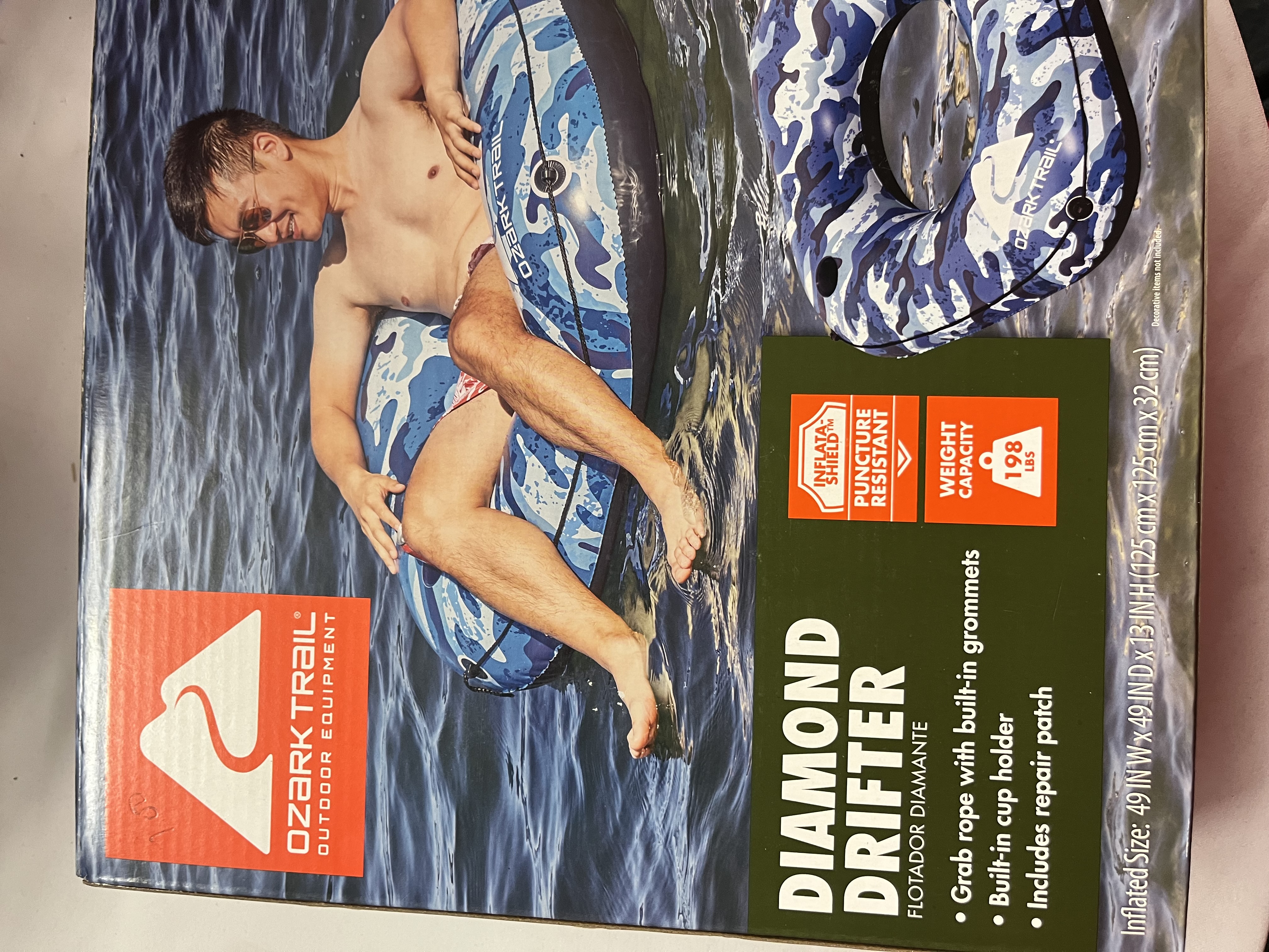 Float down the river in style with the Ozark Trail® Diamond Drifter River Tube! The cool blue camo print gives this tube an extra splash of personality. Constructed with specialized Inflata-Shield™ material, this float resists puncture, limits stretching and enhances grip. The grab rope makes it easy to transport down to the water and easily get back into the tube if you go for a swim. The tube also features a cup holder, making it easy to keep your favorite beverage or snack conveniently close. This river tube is easy to inflate once you get to your destination. Once finished, it quickly deflates and folds down to a compact size for convenient storage when not in use. This Ozark Trail Unisex Camo River Tube makes hitting the water and spending the day basking in the sun easier than ever before!