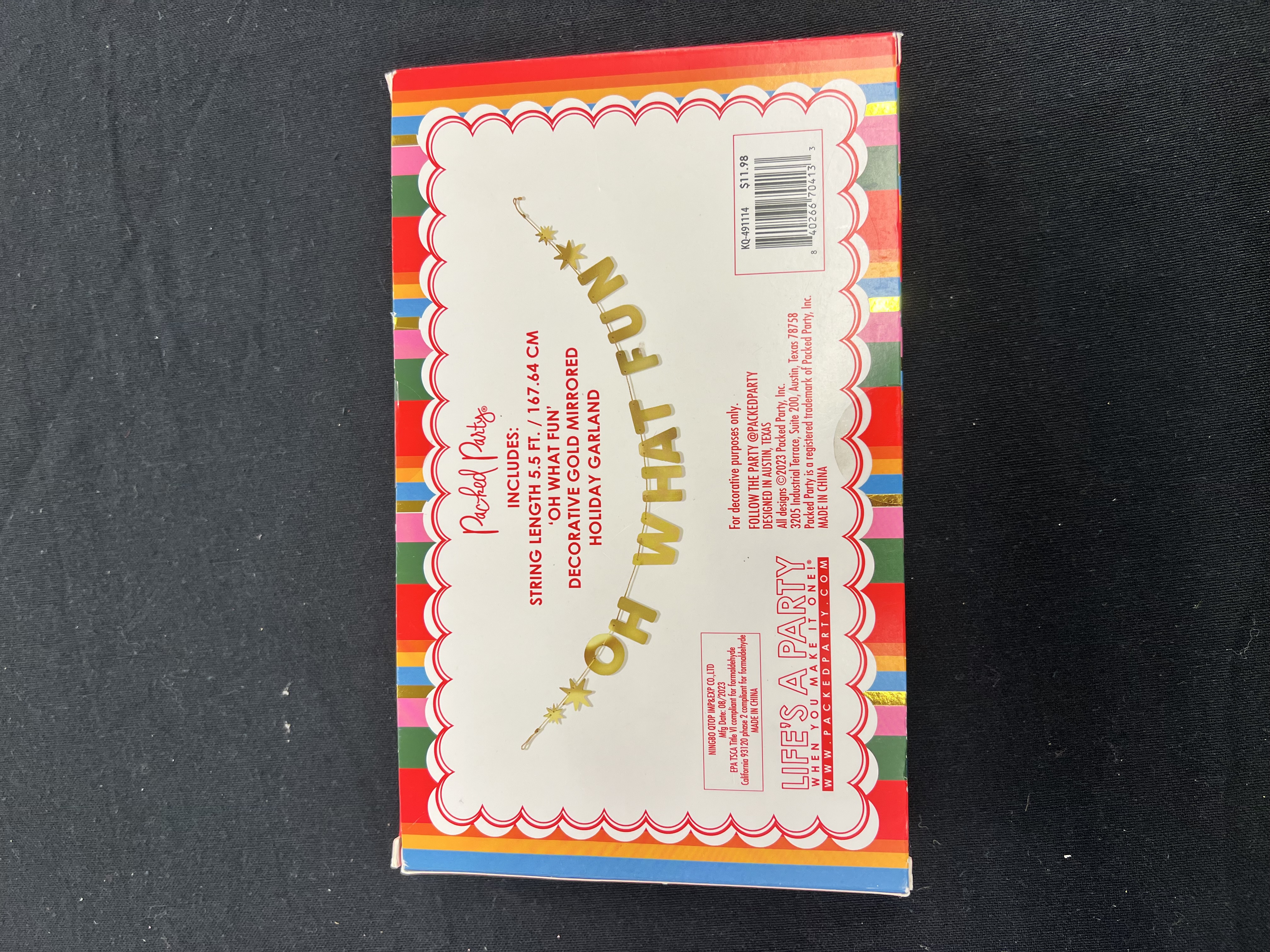 Golden letter banner "OH WHAT FUN" to add cheers and holiday spirits to your parties and gatherings. Dimensions: each letter is 4in tall. Product materials: 98% Polyester, 2% Zinc alloy