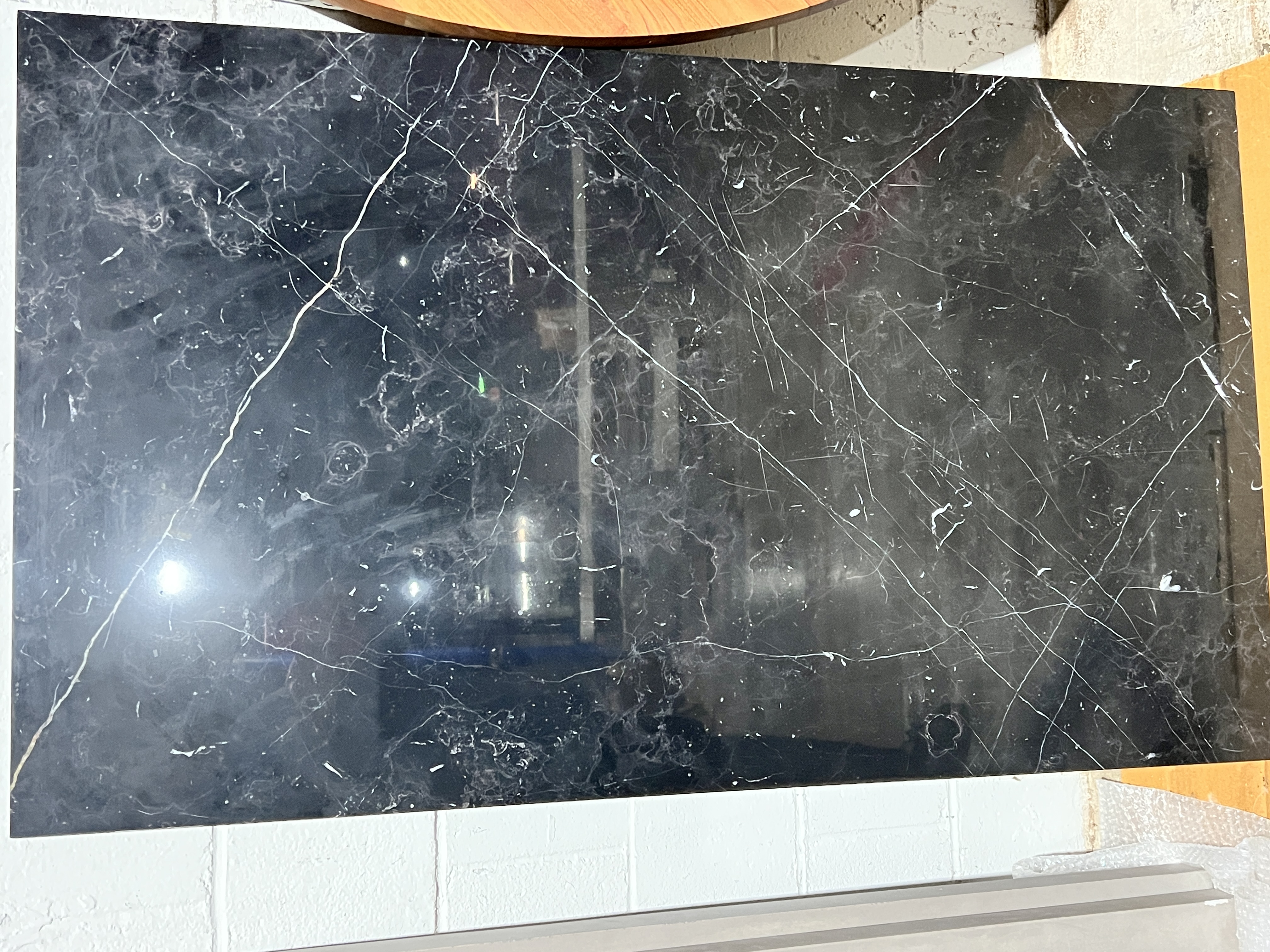 More than meets the eye, the Crate and Barrel Parsons console table is constructed of hot-rolled steel with handcrafted details. The steel is hand-welded and ground at each corner, making each piece unique. A raw-torched millscale finish adds to its refined, industrial aesthetic. In elegant counterpoint, the black marble top showcases a unique constellation of white veining with a super smooth matte finish.