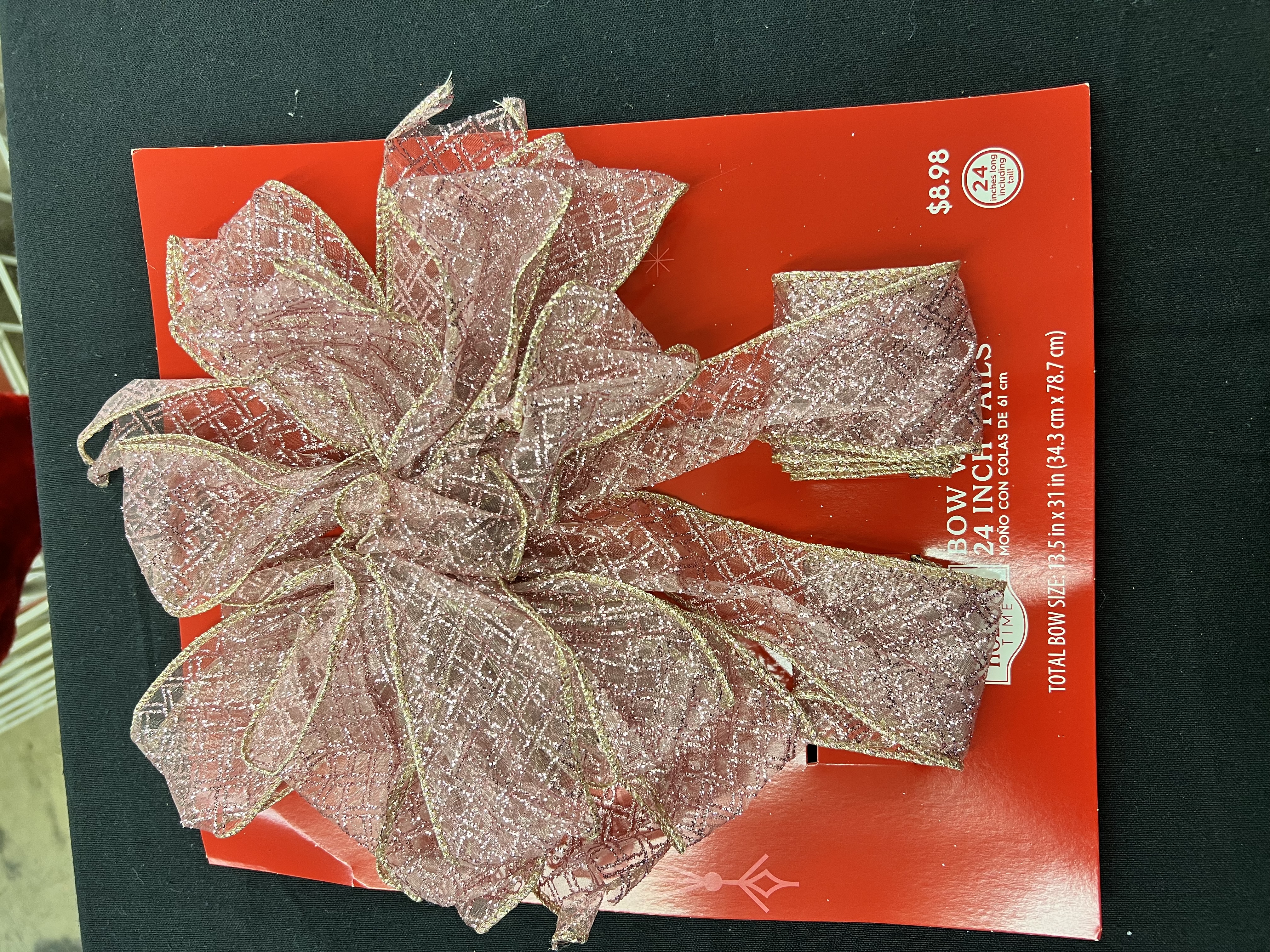 Holiday Time Bow with Tails, Pink/Gold Glitter, 14" Twist-tie back easily secures the bow onto holiday greenery Lightweight design is perfect for homes with children or pets Can be used with both natural and artificial Christmas trees or garland Product measurements: 13.50" x 2.25" x 14.00" Product Color: Pink;Gold Product Materials: 92% Nylon, 3% Glitter,5% Iron
