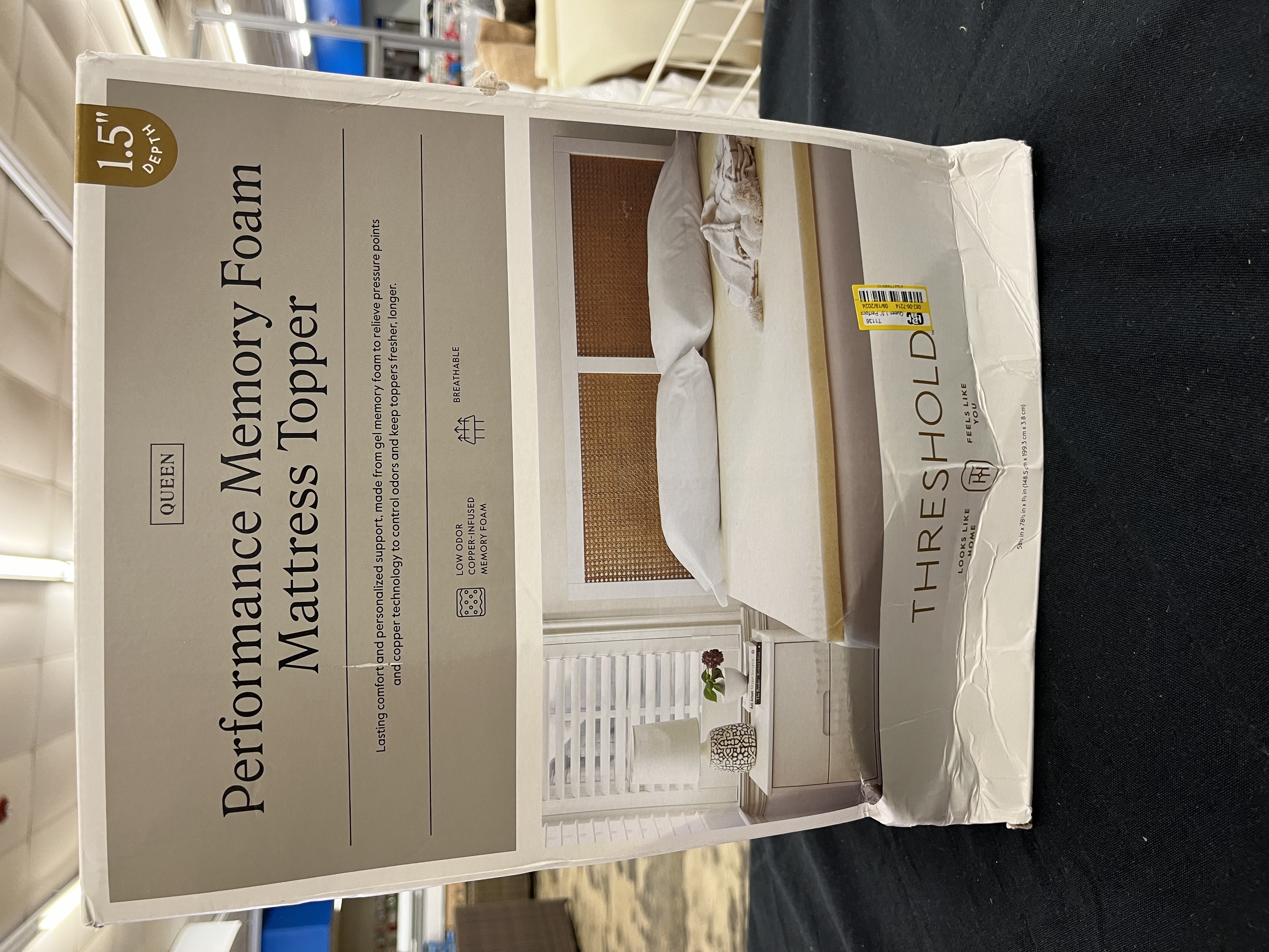 Enhance the comfort of your existing mattress with this Memory Foam 1.5-Inch Mattress Topper from Threshold™. This mattress topper is made with cool-touch technology to create a cool, comfortable and refreshing sleep environment. Made from soft memory foam material, it adapts to the shape of your body for improved comfort and support while sleeping. This cooling mattress topper fits a maximum mattress depth of 12 inches, and it can be spot cleaned as needed for easy upkeep. • 1.5in memory foam mattress topper • Cool-touch design • Fits up to 12in mattress depth • Spot or wipe clean • Cream color