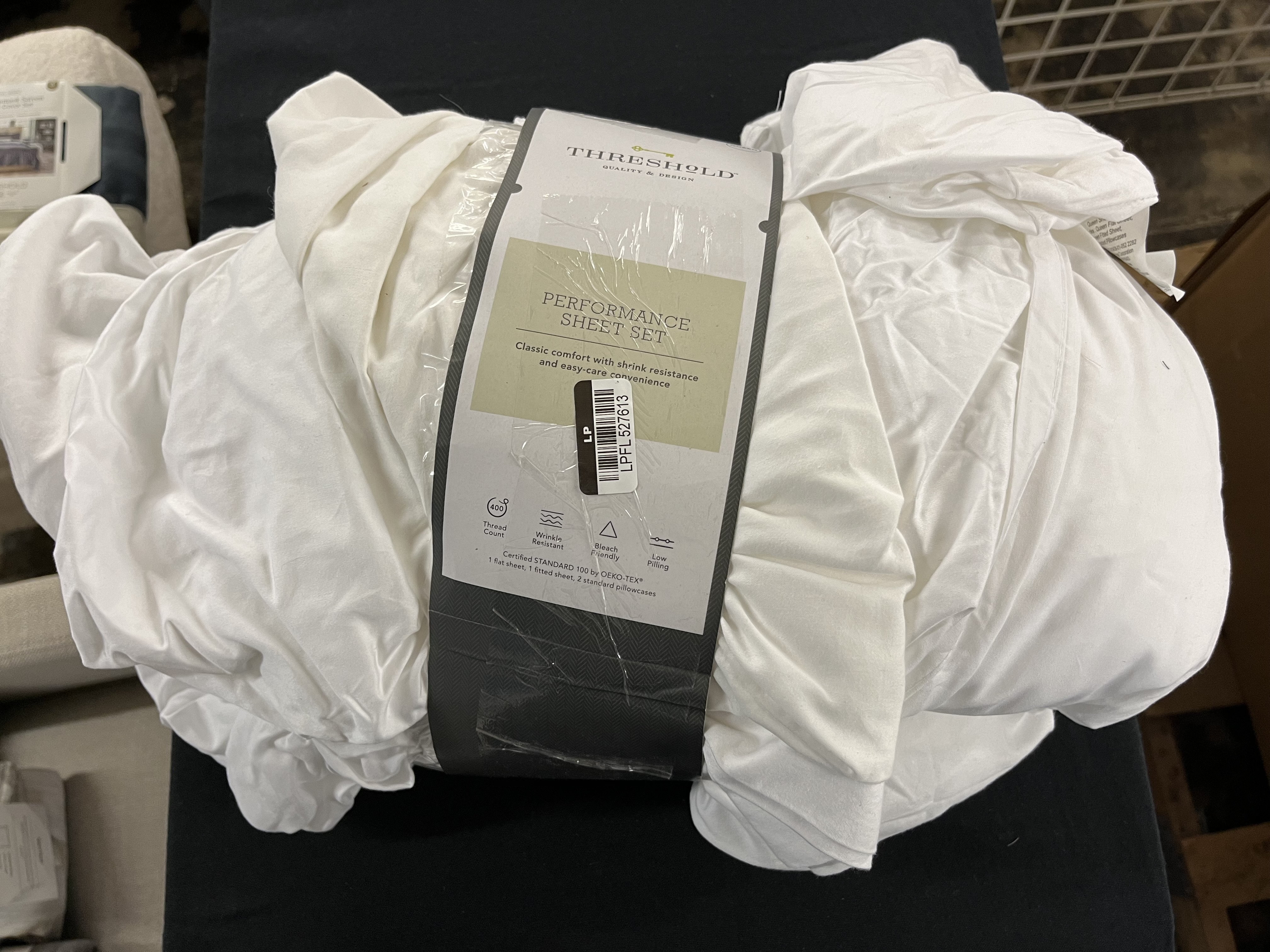 Give your bed a new look and feel with a 400-Thread Count Solid Performance Sheet Set from Threshold™. Cut from 100% cotton fabric with a thread count of 400 and a sateen finish, this bedding set creates a perfectly luxurious sleeping space, and the solid-color design mixes well with a wide variety of styles for easy integration into your bedding ensemble. Wrinkle-, pill- and shrink-resistant construction keeps these sheets looking their best, while top and bottom labels make placement a breeze. Simply pair with your choice of comforter or quilt and a bank of pillows for a bedding upgrade that will have you counting the minutes until bedtime.