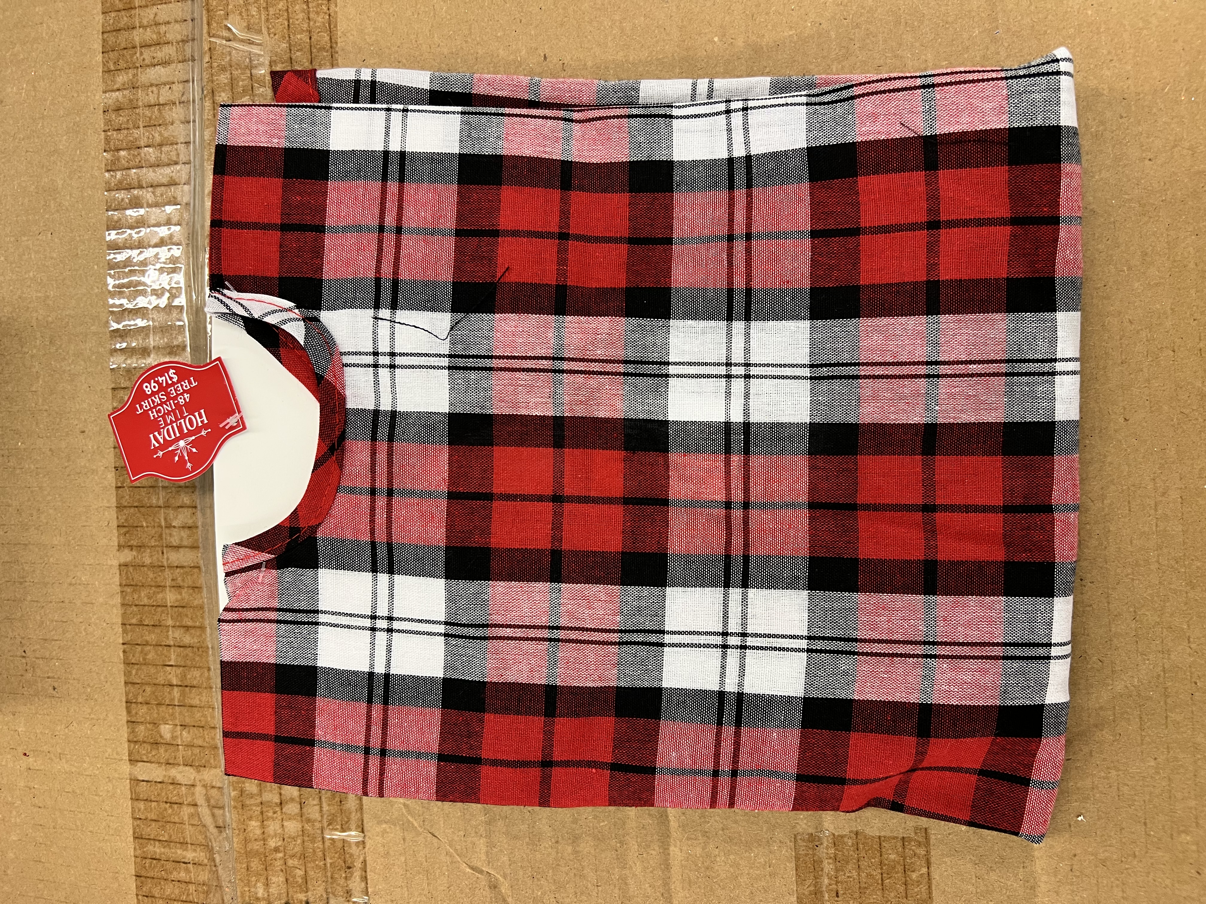 Holiday Time Red Tartan Plaid Tree Skirt, 48-Inch; Color: Red and White Drap the skirt around the base to hide the tree stand Product Dimensions: 48 x .5 x 48 Inch Product Material: 100% POLYESTER