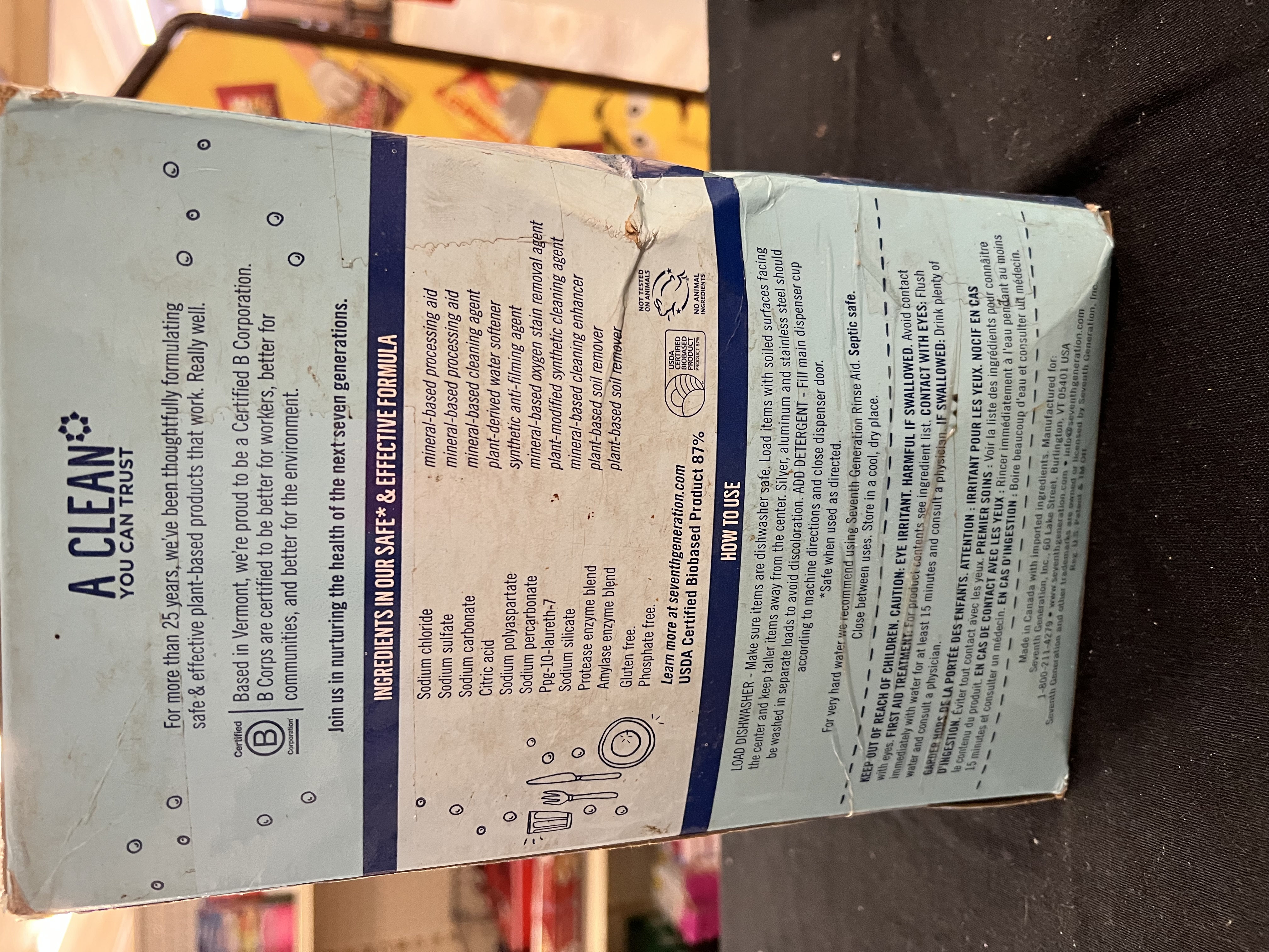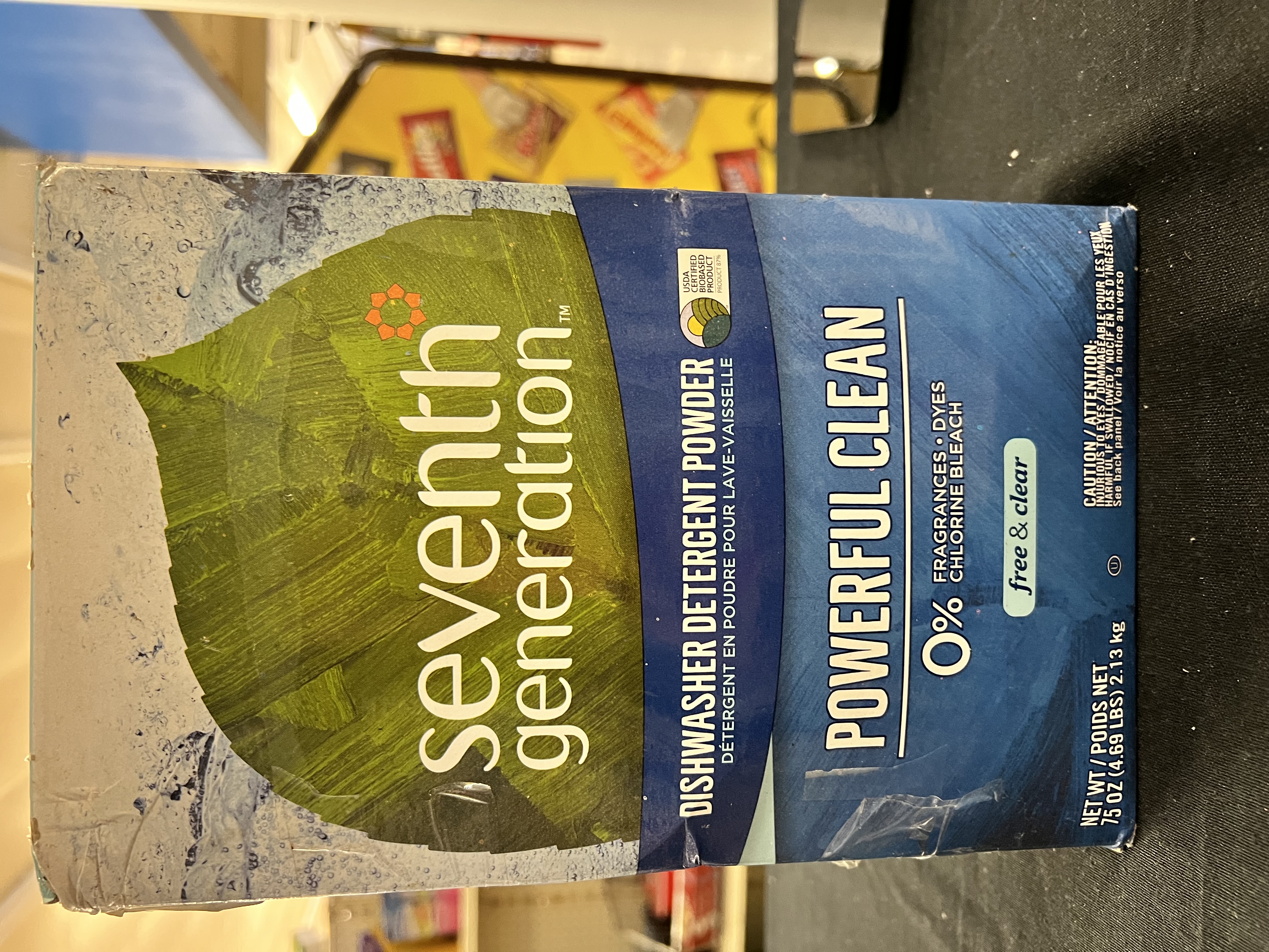 Seventh Generation Clean with Purpose Fresh Free and Clear Dishwasher Detergent, 75 oz 1 Count. Seventh Generation Free Clear Dishwasher Detergent Powder makes effortless work of whatever is waiting in your dishwasher, without the use of fragrances, dyes, chlorine bleach, or phosphates. Our powerful formula reduces spotting and filming, leaving your dishes sparkling clean with a streak-free shine. This dishwasher powder soap is biodegradable, septic safe, and is a plant-based USDA Certified Biobased Product 87%. As always with Seventh Generation products, our dish soap is never tested on animals and is certified cruelty-free by the Leaping Bunny Organization. For maximum effectiveness in hard water, use Seventh Generation Dishwasher Rinse Aid. Based in Vermont, Seventh Generation is proud to be a Certified B Corporation, increase performance and safety, and create a more sustainable supply chain. We believe it is our responsibility to set a course for a more mindful way of doing business, where companies act as partners with other stakeholders to create a brighter future for the whole planet. By choosing Seventh Generation products, you are joining us in nurturing the health of the next seven generations