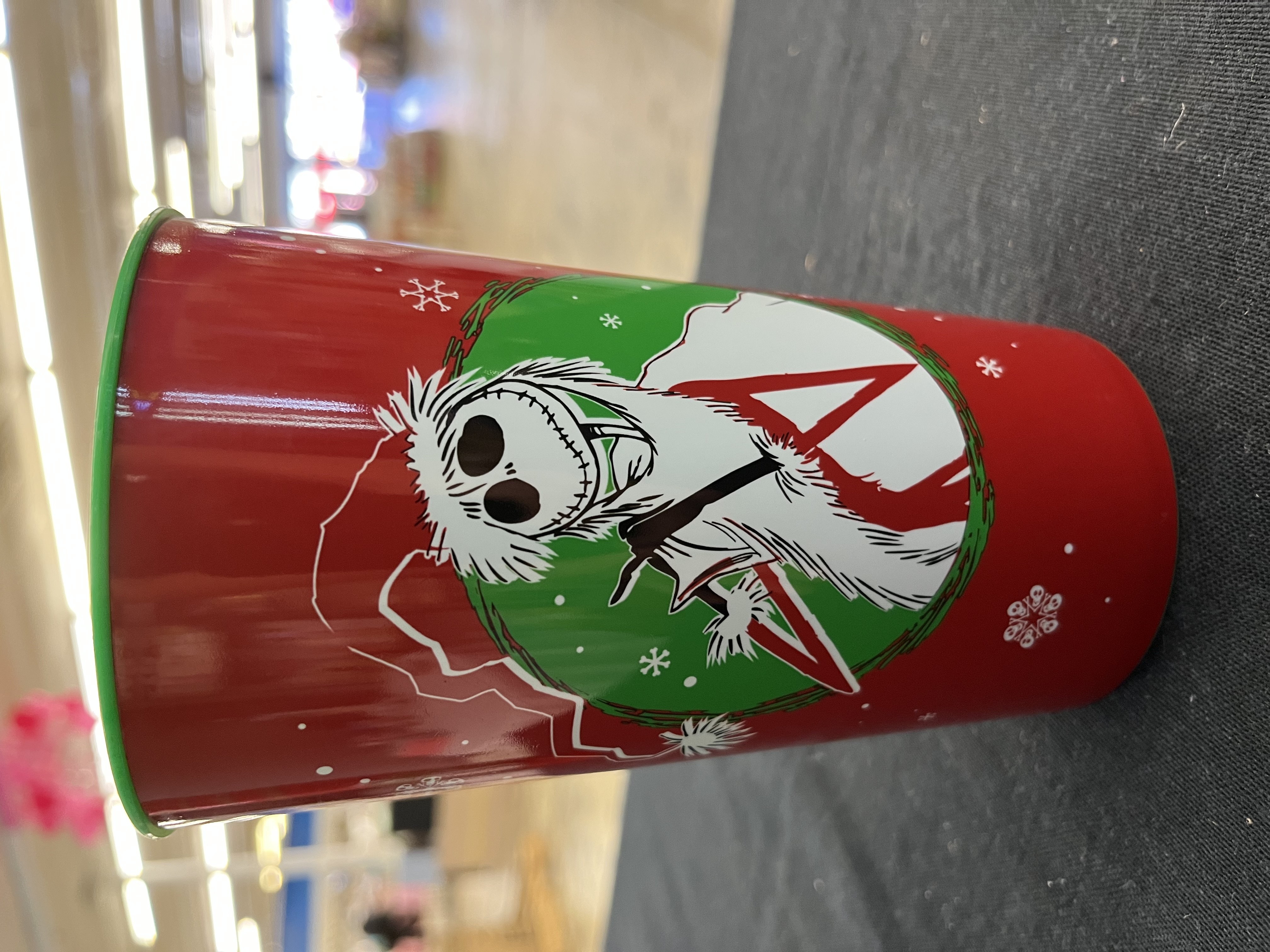 FESTIVE CHRISTMAS PLASTIC CUPS: This 4-piece of 22-ounce plastic cups feature Jack Skellington The Pumpkin King dressed as Sandy Claws or Santa Clause. With a Holiday Red and Green Background