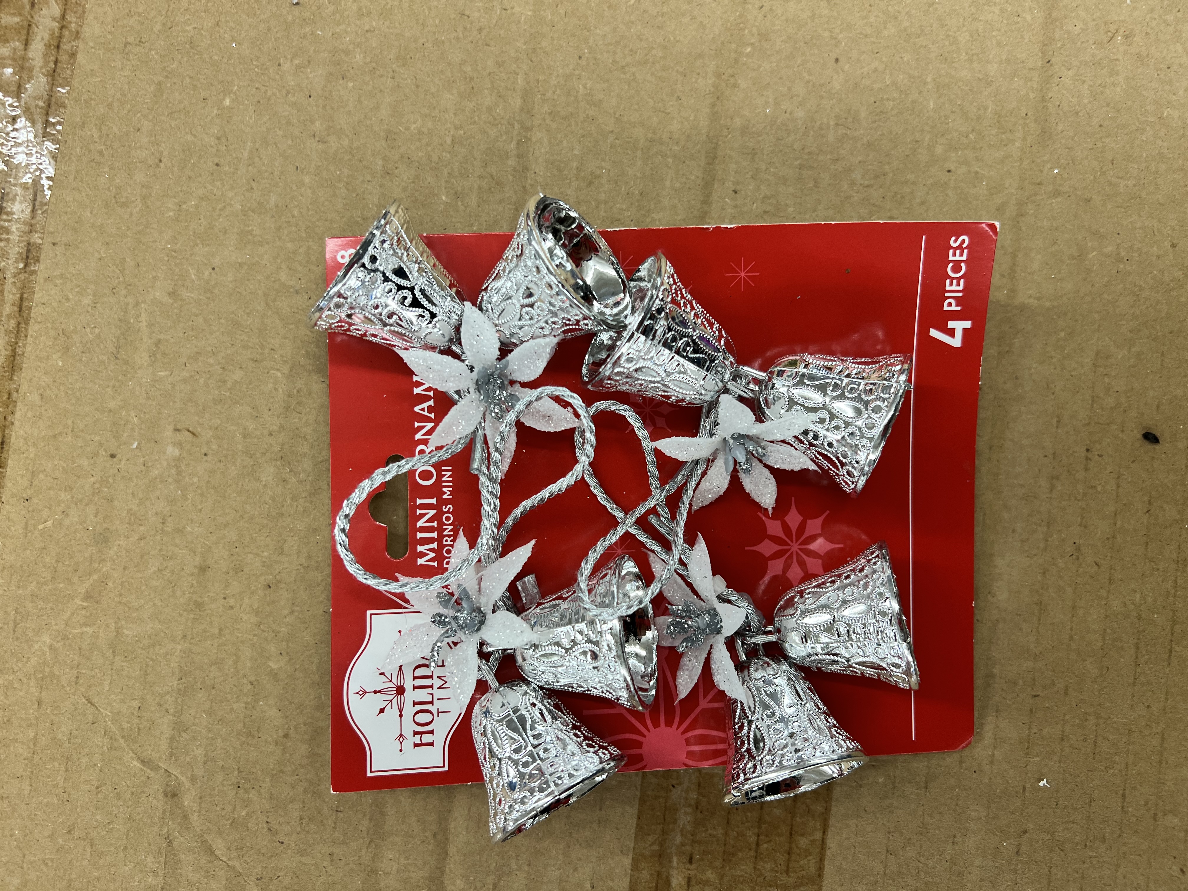Holiday Time Silver Double Bell Mini Christmas Ornaments, 4 Count Use to decorate your tree Add to a stunning seasonal decoration Attached loop at the top makes them easy to display Check out all the joyful Christmas decorations from Holiday Time like inflatable characters, twinkling lights, colorful wreaths, and more