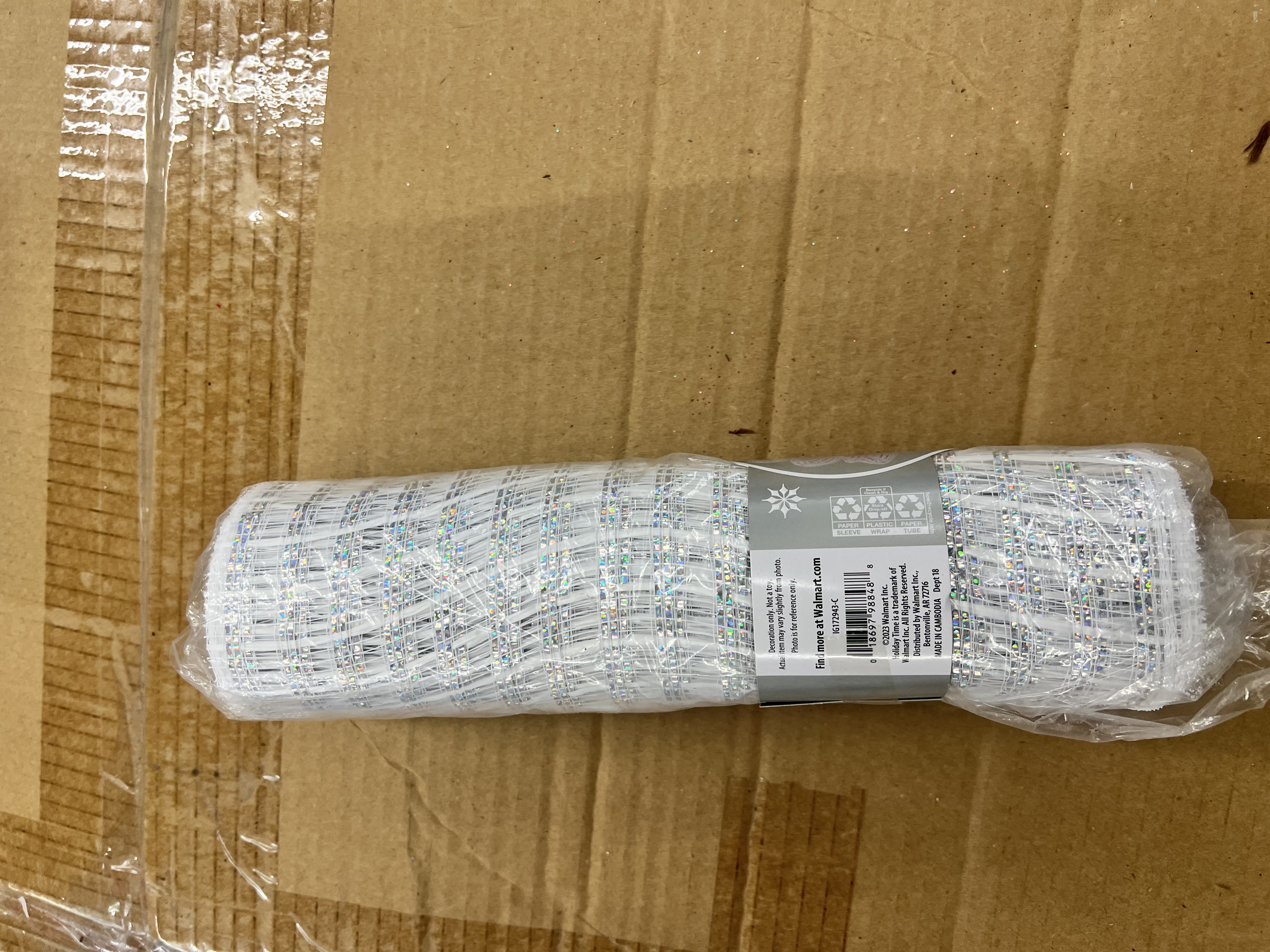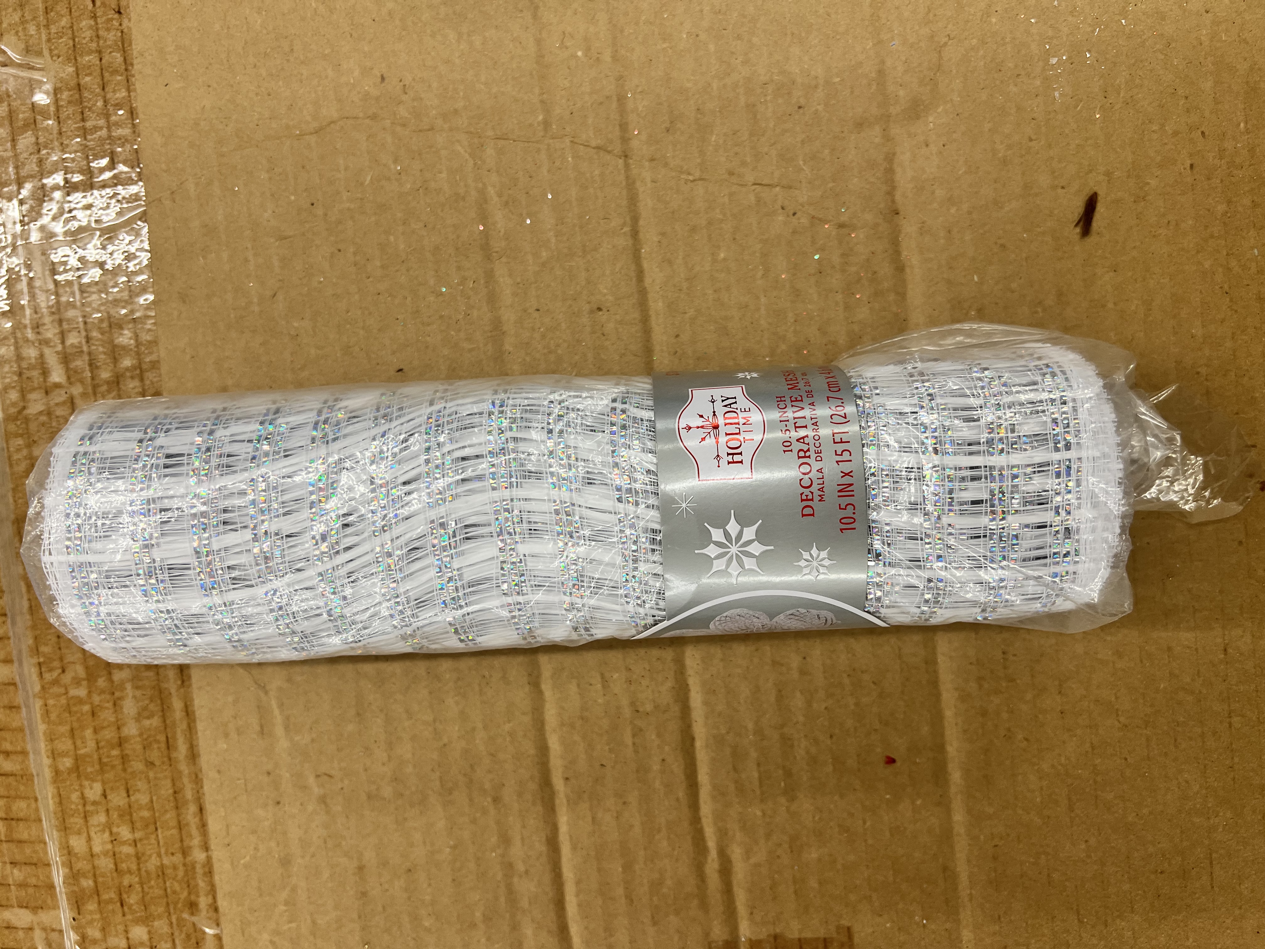 Holiday Time Silver Fabric Decorative Christmas Mesh Roll, 18 in x 12 ft Use to add texture and color to your holiday decor Convenient rolled design makes dispensing and cutting easy Use to add extra flair to your wrapped gifts Create wreaths, centerpieces, or floral arrangements using multiple colors Versatile material works for a number of projects Recommended for indoor and covered outdoor use Material: 75% PP, 25% PET