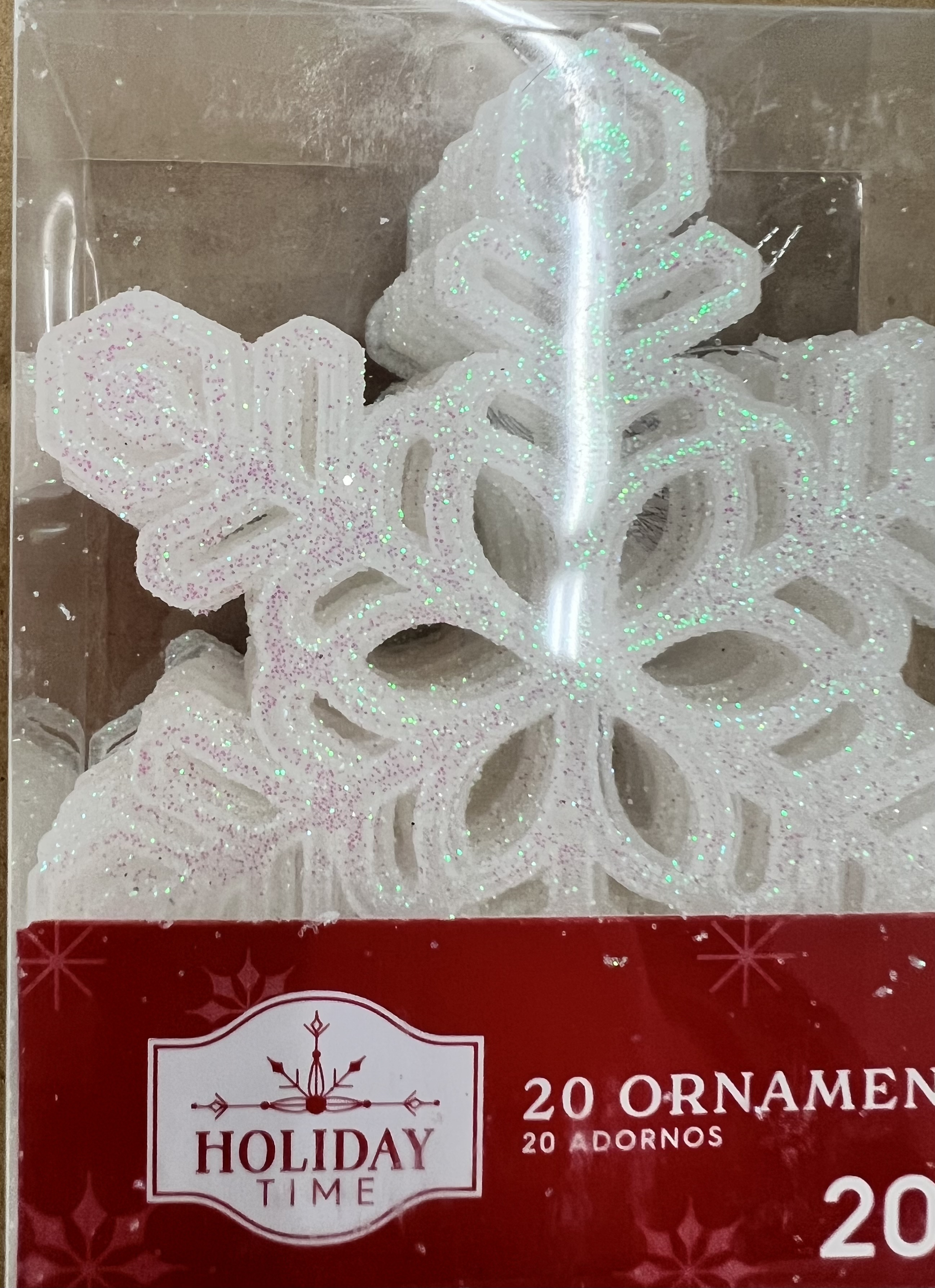 Holiday Time Silver Glitter Snowflake Christmas Ornaments, 3.94 in, 20 Count Use to decorate your tree Add to a stunning seasonal decoration Attached loops make them easy to display anywhere Check out all the joyful Christmas decorations from Holiday Time like inflatable characters, twinkling lights, colorful wreaths, and more