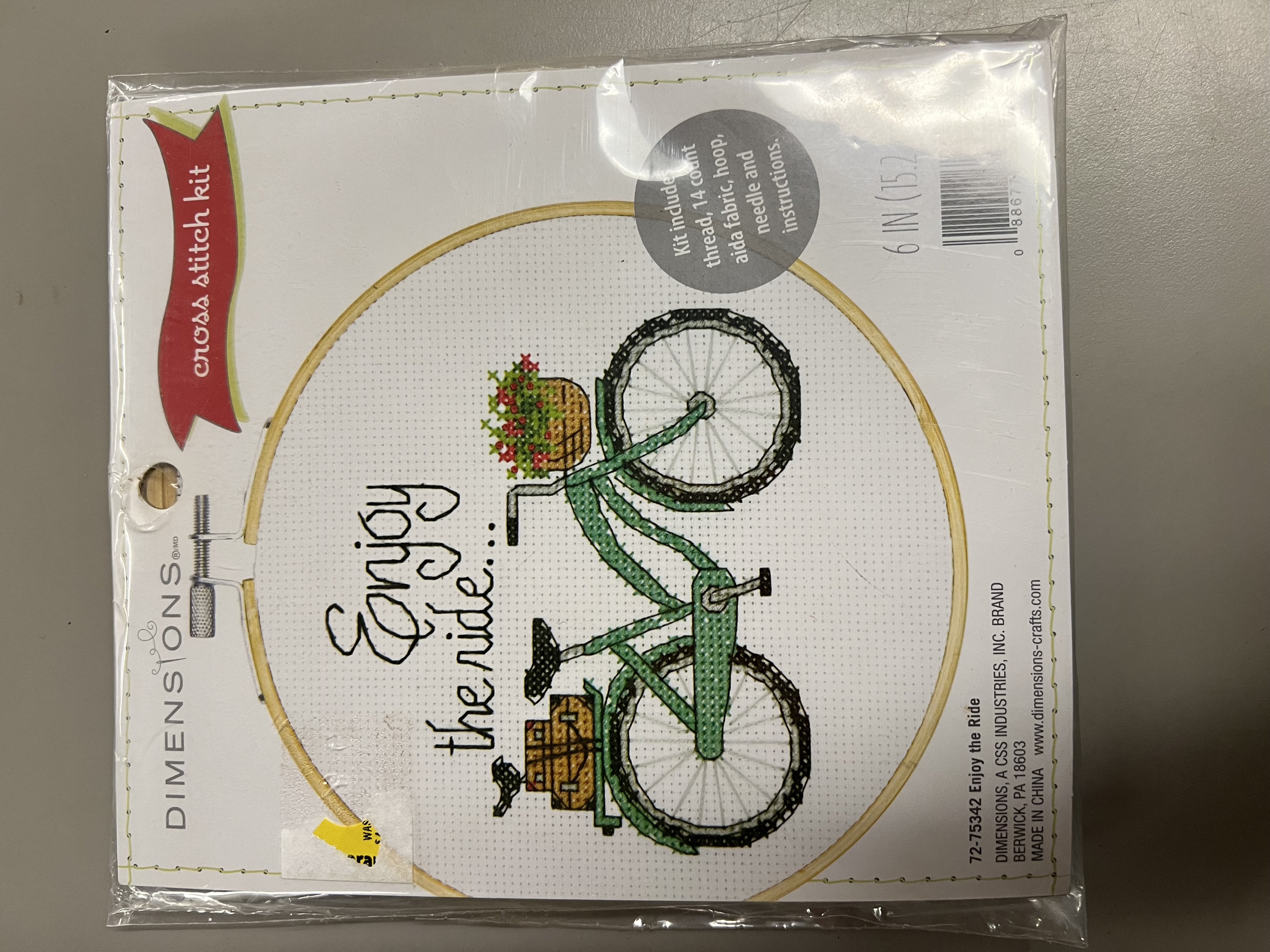 Simplicity Enjoy the Ride Cross Stitch Kit. Perfect projects for anyone to discover the many joys of stitching. This fun Enjoy the Ride counted cross stitch kit features step-by-step beginner instructions that make it fun to be creative! Finished size: 6" diameter. Counted cross stitch kit includes: • Presorted cotton thread• 14 count white Aida fabric• 6" plastic hoop for stitching and finishing• Needle• Easy instructions