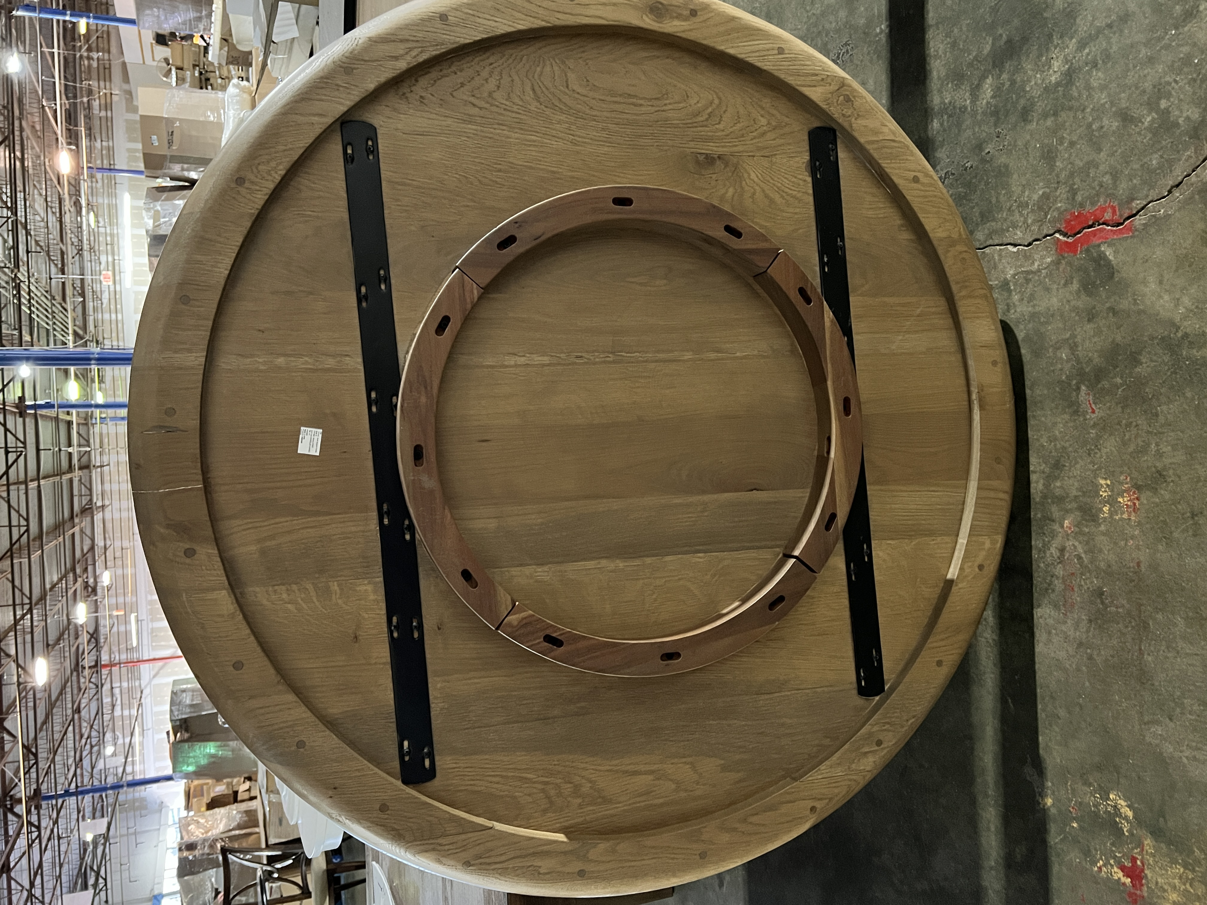 Thick, oak base and round shape of this GQ dining table invites durability and midcentury design into the home. Pull up leather/metal seating for an industrial edge or surround with all black to add contrast. Seats four comfortably. • Designed by GQ • Oak veneered base with solid oak top • Seats up to four • Clean with soft, dry cloth • Do not leave spills unattended • Use of coasters is recommended; protect from heat and liquids