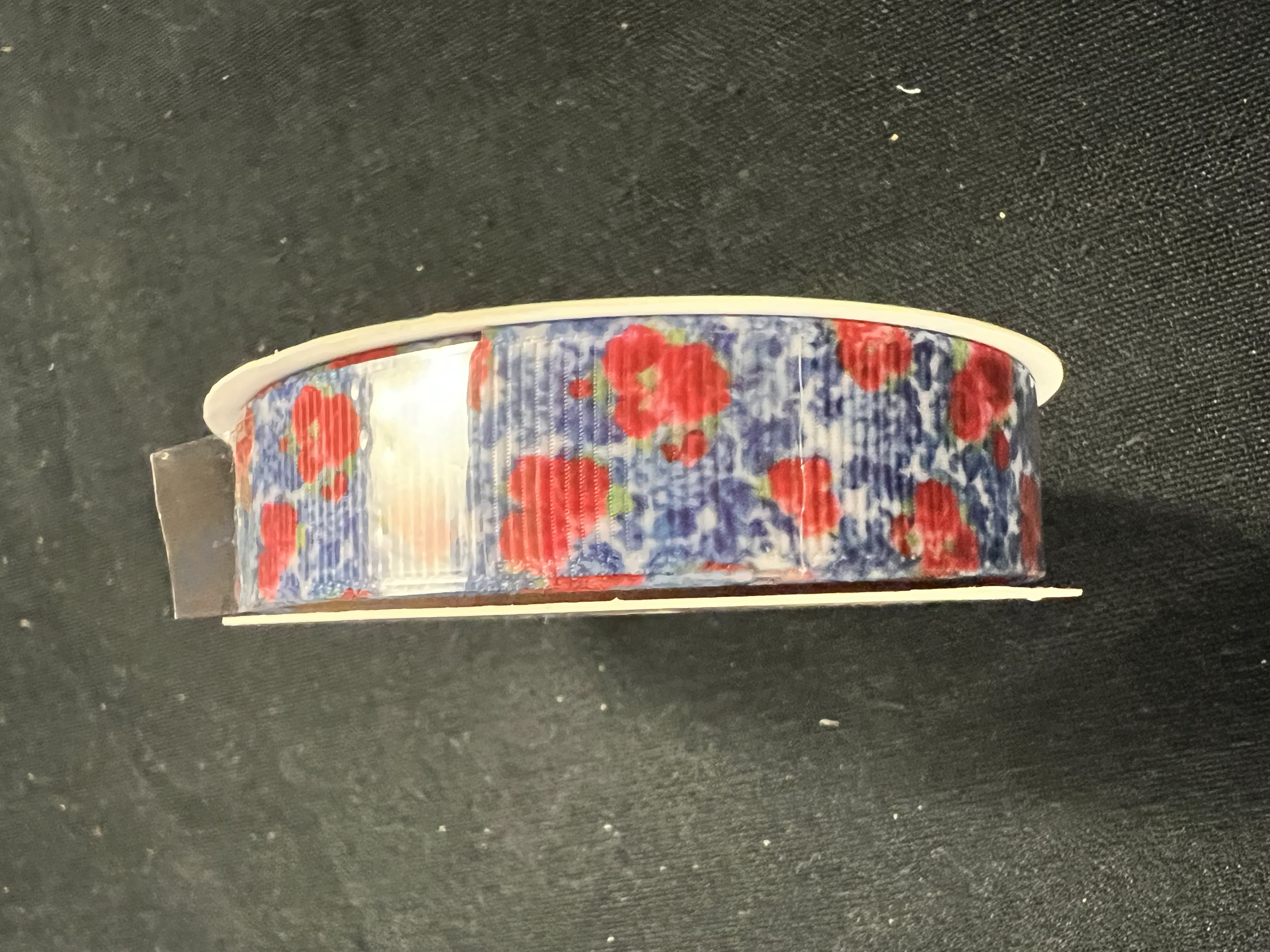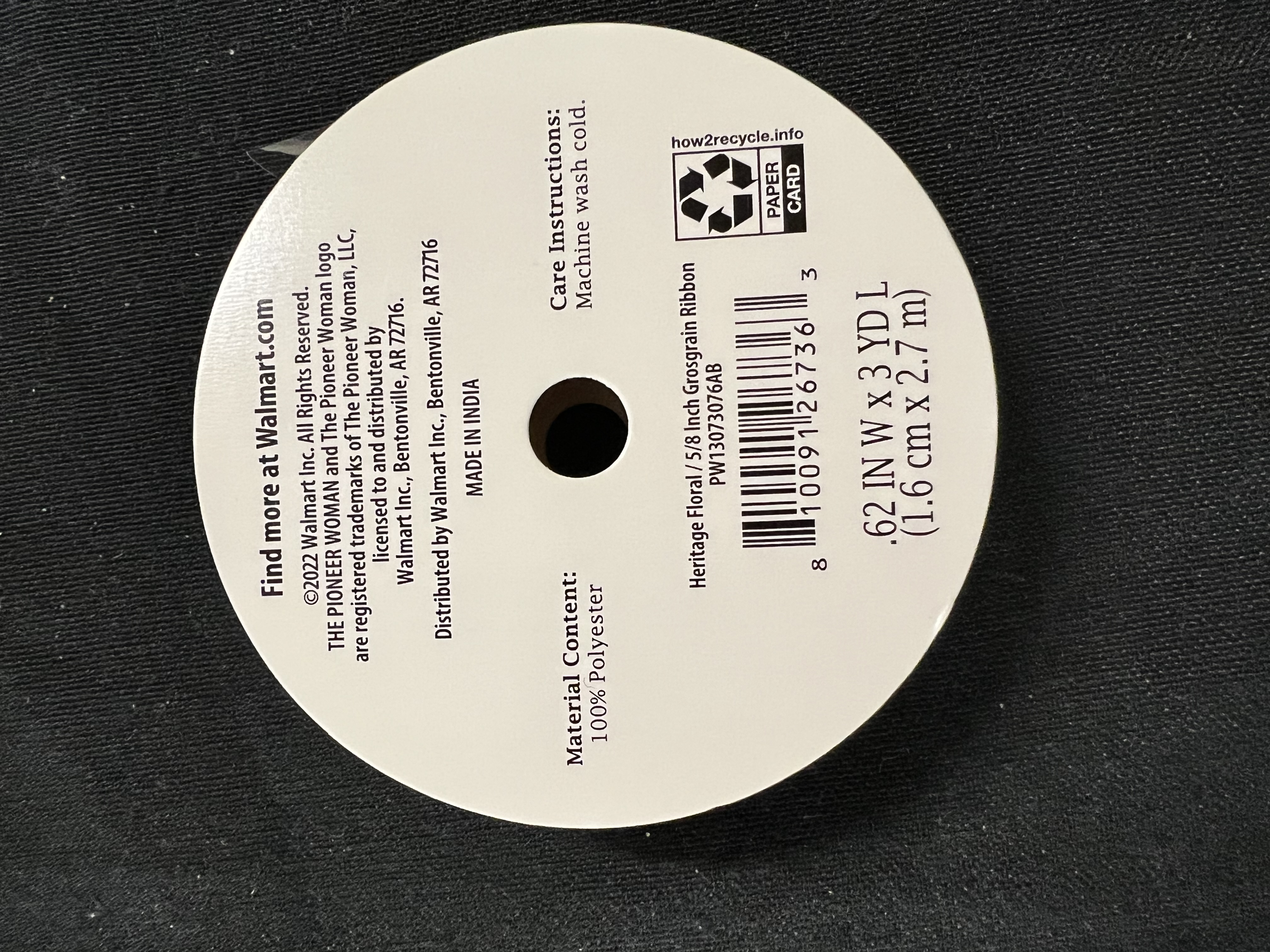 White grosgrain ribbon Features Ree's signature Heritage Floral pattern in bold shades of red and blue Safe for sewing Perfect for gift wrapping and creating one-of-a-kind crafts 100% polyester with fray-resistant edges Machine washable Won't shrink or fade Available in a selection of prints and styles to fit every unique project Roll includes 9' of 5/8" wide grosgrain ribbon