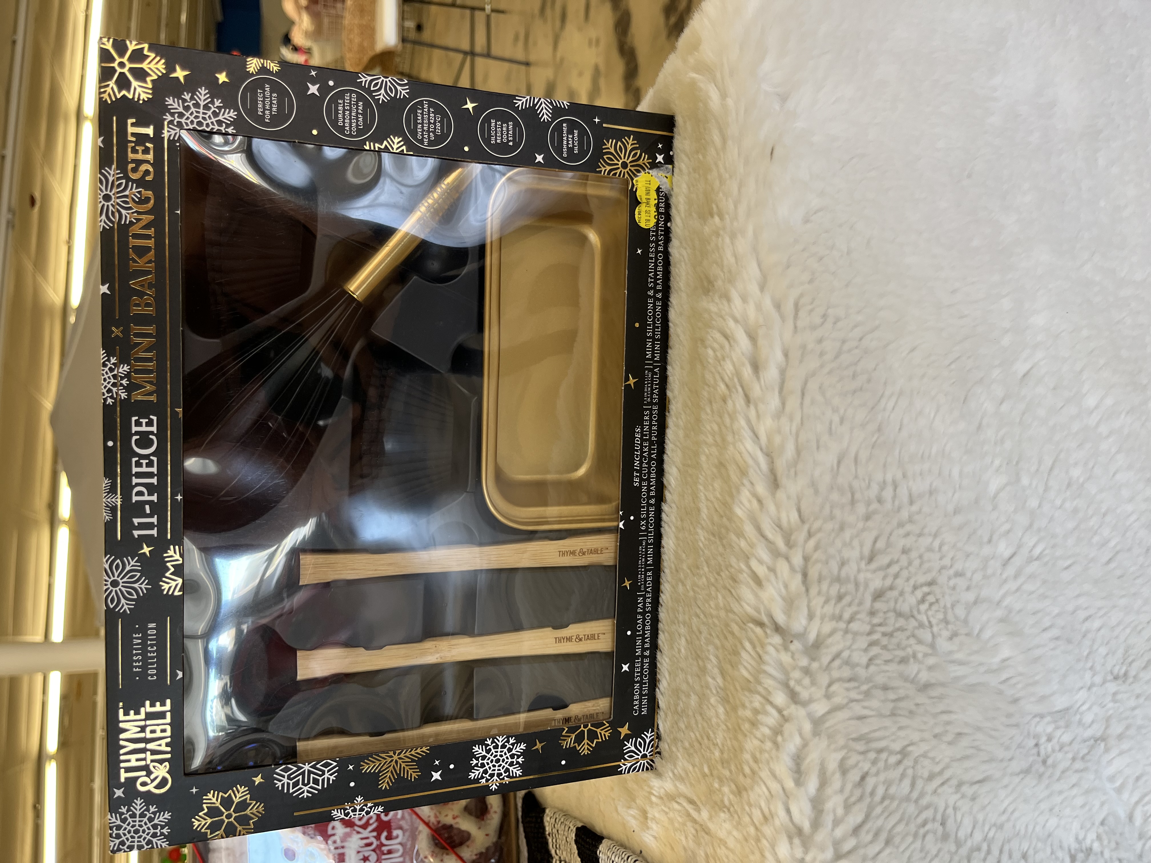 Thyme & Table 11-Piece Mini Baking Set, Gold is a part of Thyme & Table's Festive Collection. This mini baking set includes a carbon steel mini loaf pan, mini silicone & stainless steel whisk, mini silicone & bamboo spreader, mini silicone & bamboo all-purpose spatuala, mini silicone & bamboo basting brush, and 6x silicone cupcake liners. The durable carbon steel constructed loaf pan is oven safe up to 428. The silicone tool are heat resistant up to 428. For care and use, please hand wash in warm water with dish soap and a soft sponge.