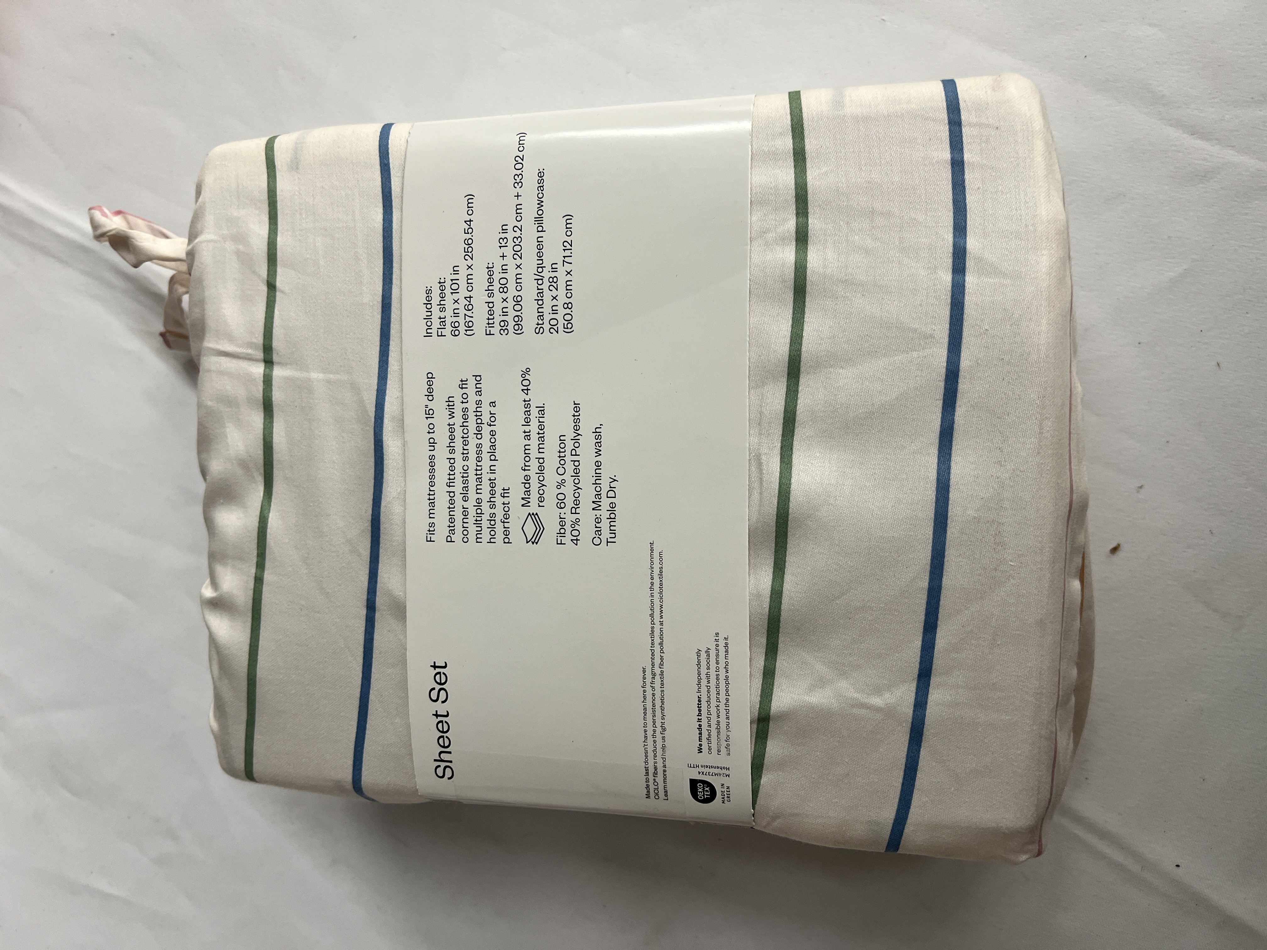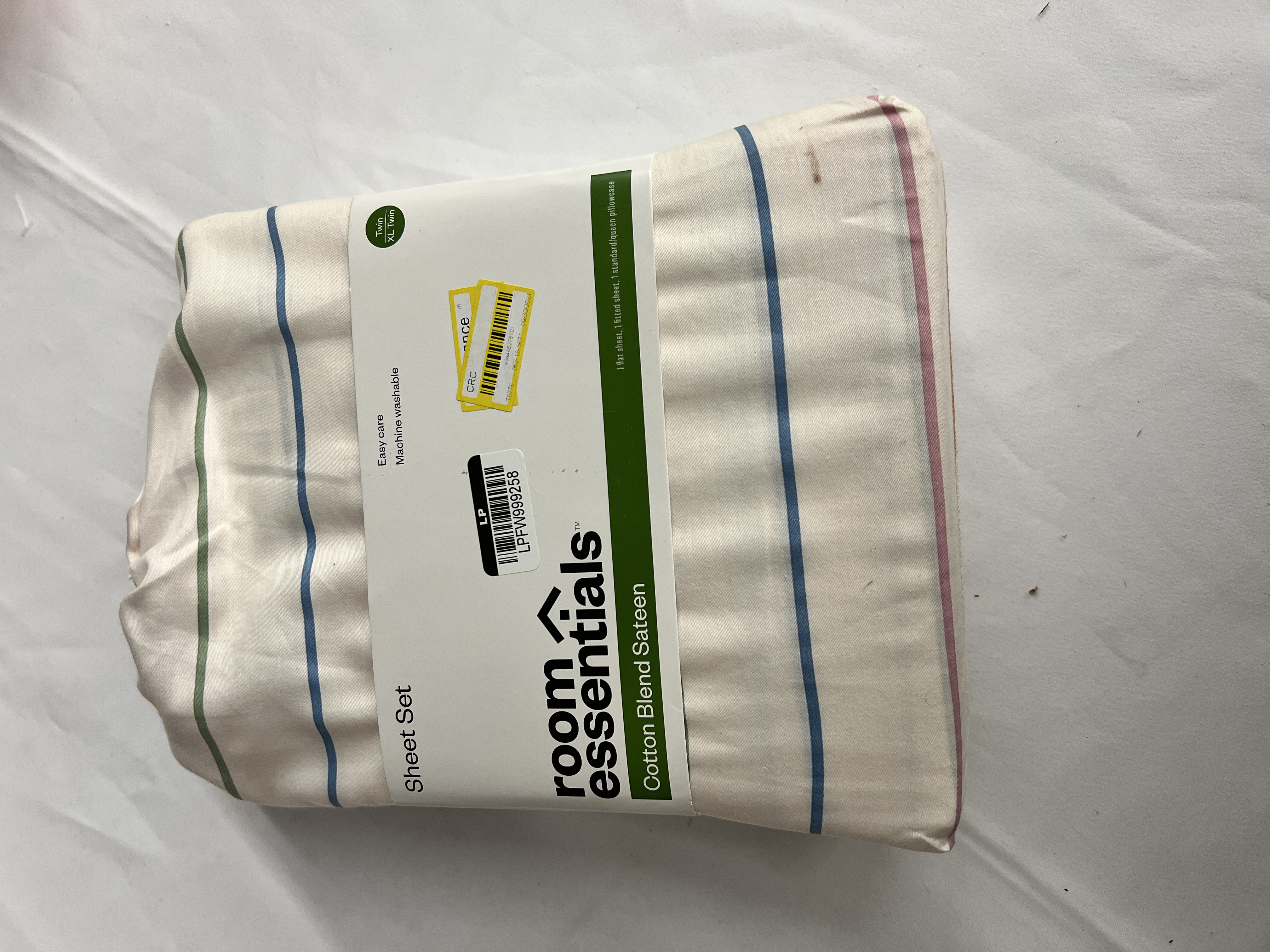 Give your sleeping quarter a luxurious makeover with this Cotton-Blend Sateen Sheet Set from Room Essentials™. Made from a soft and breathable cotton and polyester blend fabric for year-round comfort and durability, this sheet set includes a flat sheet, a fitted sheet, and marching pillowcase(s) in soothing colors to help you create a cozy and comfortable retreat. Best of all, you can simply toss this set in the washing machine for quick and easy cleaning. • Cotton and recycled polyester blend sateen sheet set • Sateen weave • 225 thread count • Machine washable for easy-care • Top and bottom labels for easy placement • Fitted sheet includes full perimeter elastic to stay secure to your mattress • Includes pillowcase(s), 1 flat sheet and 1 fitted sheet • Made in Green by OEKO-TEX