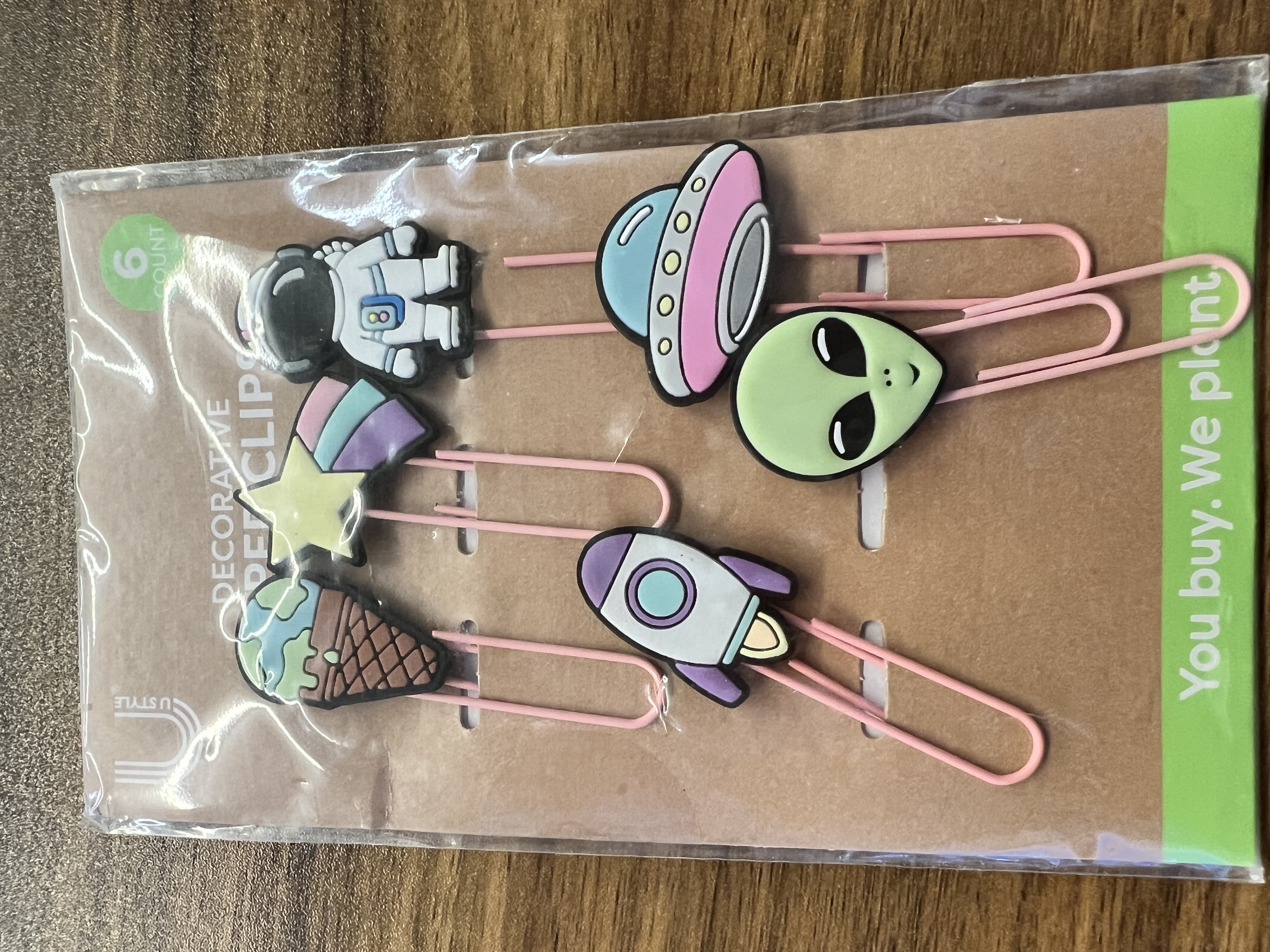 U Style Decorative Paper Clips are perfect for keeping stacks of paper together in style. These decorative paper clips come in four unique designs: Out of the World, Danger Zone, Happy Camper, and Recycle, so you can choose the one that best fits your personality or the theme of your project (each design sold separately). Not only are these paper clips functional, but they're also fun and whimsical. The unique designs add a pop of color and personality to your documents, making them stand out from the crowd. The U Style Decorative Paper Clips are made from high-quality metal, ensuring that they're strong and durable enough to hold together even large stacks of paper. They're also easy to use, simply slide them onto your documents, and they'll stay securely in place. A portion of each purchase is donated to One Tree Planted, a non-profit fighting climate change, by planting 25 million trees in 43 countries.