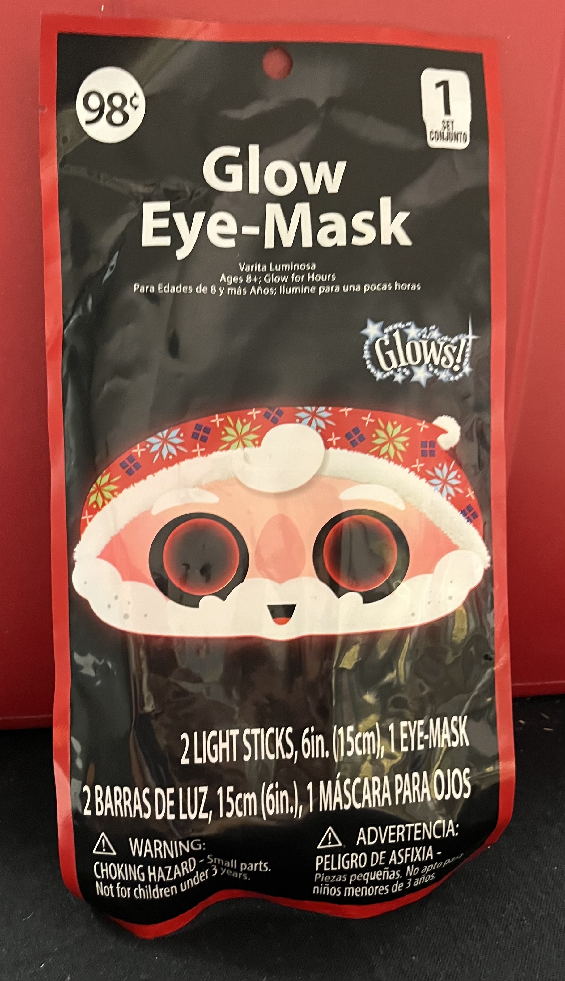 Vendor Labeling 1CT Glow Party Favors, Red Plastic Glow Santa Eyemask. Each pack contains 2 pieces of a 6-inch glow stick, a 1pc plastic Eyemask, and a plastic connector. It's great for different occasions such as Halloween, birthdays, and various sizes of Parties. Just activate the glow stick and connect it to plastic pieces. The bright glow lasts for 6-8 hours. It suits Unisex, Children, and even Adults. Let's get this glow item so you can stand out in any nighttime event. Product size: 10.5" x 0.5" x 5.5"; Weight: 26g
