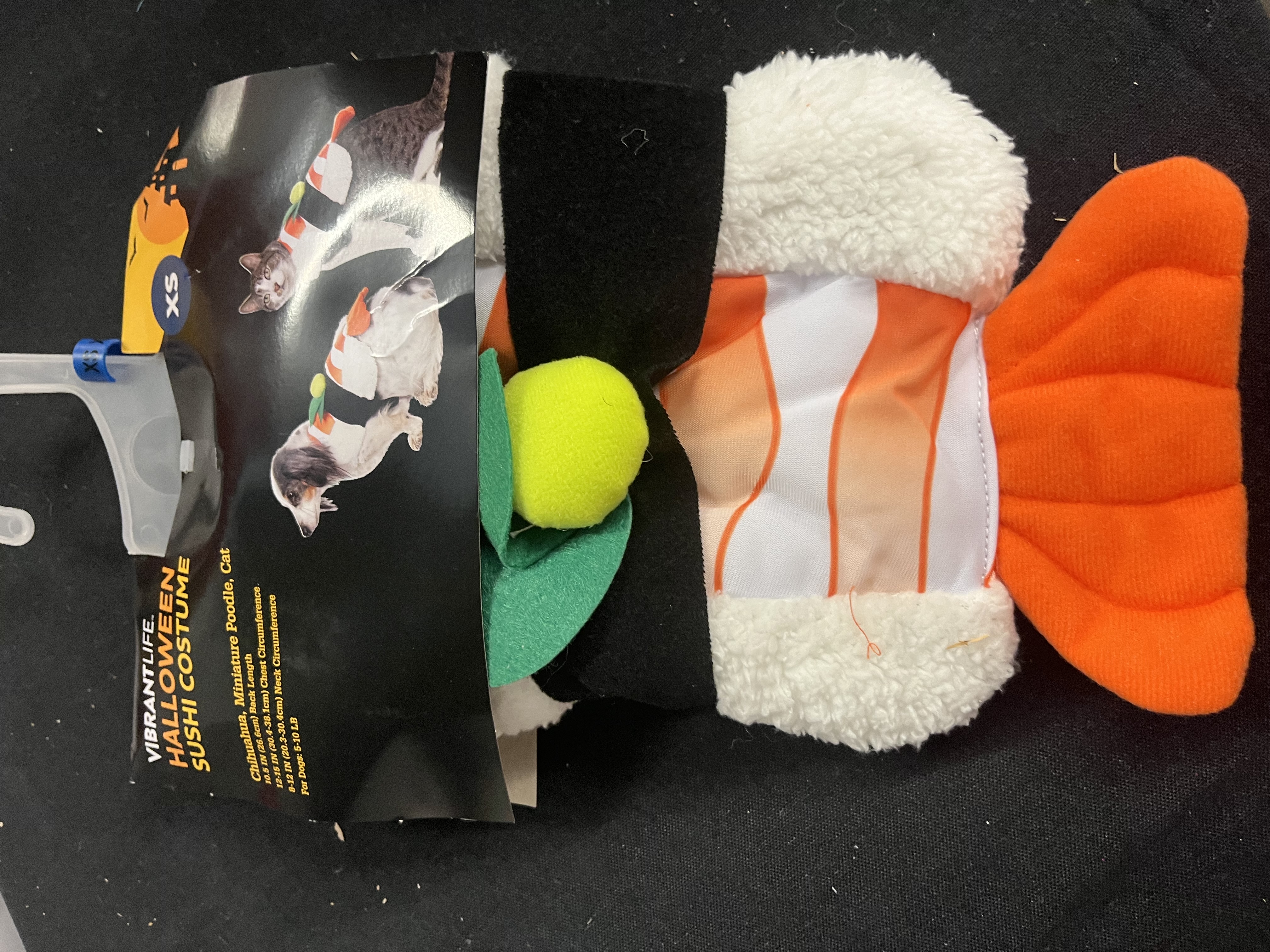 Your pet can join in the Halloween celebrations with the Vibrant Life Sushi Pet Costume. This one-piece stuffed costume features hook and loop closure around the pet's neck, with wide elastic with hook and loop fastener for comfortable, adjustable fit around the pet's belly. Easily find the perfect fit for your pet and let them show up for Halloween parties and trick-or-treating, putting their best paw forward.