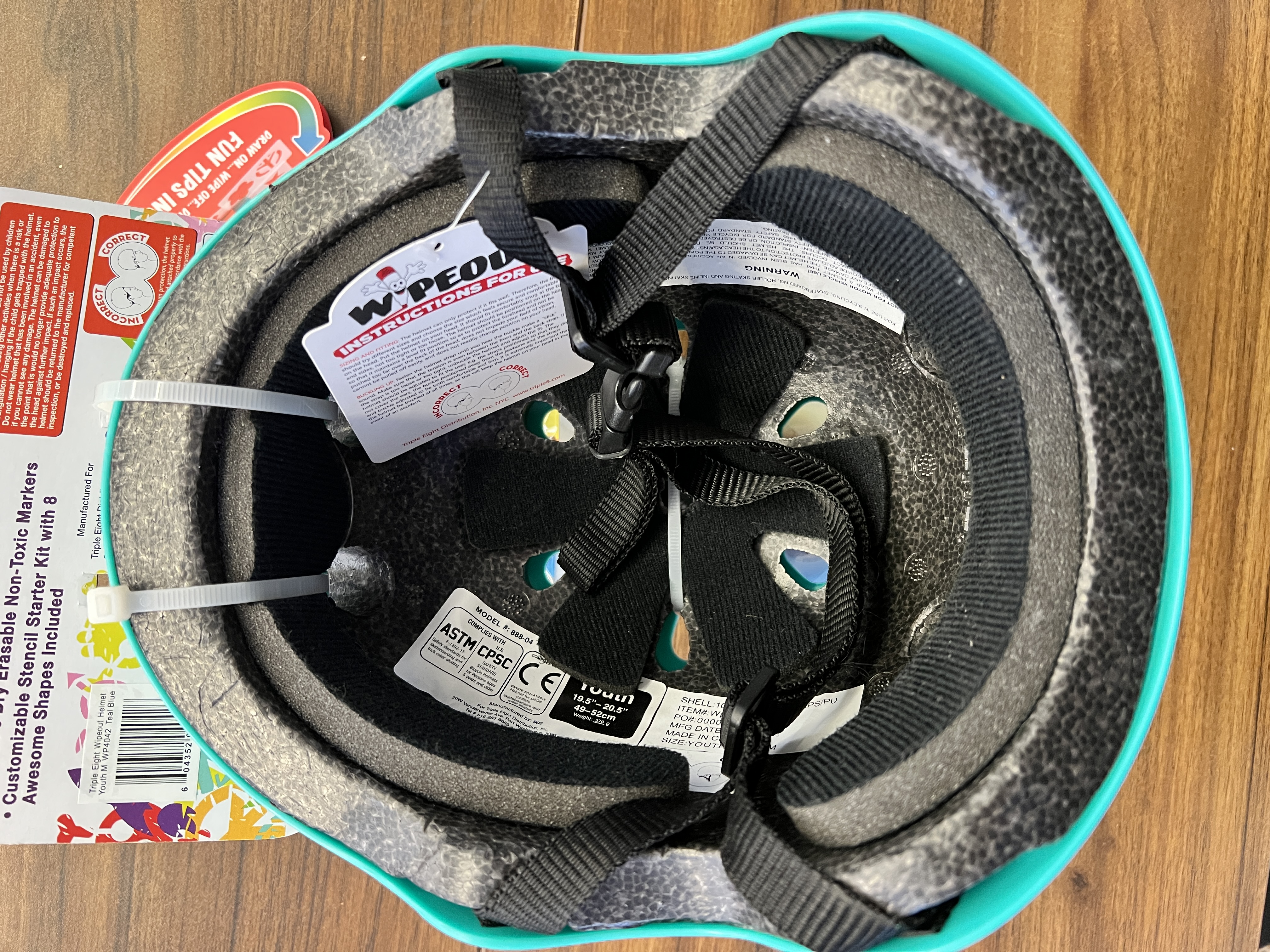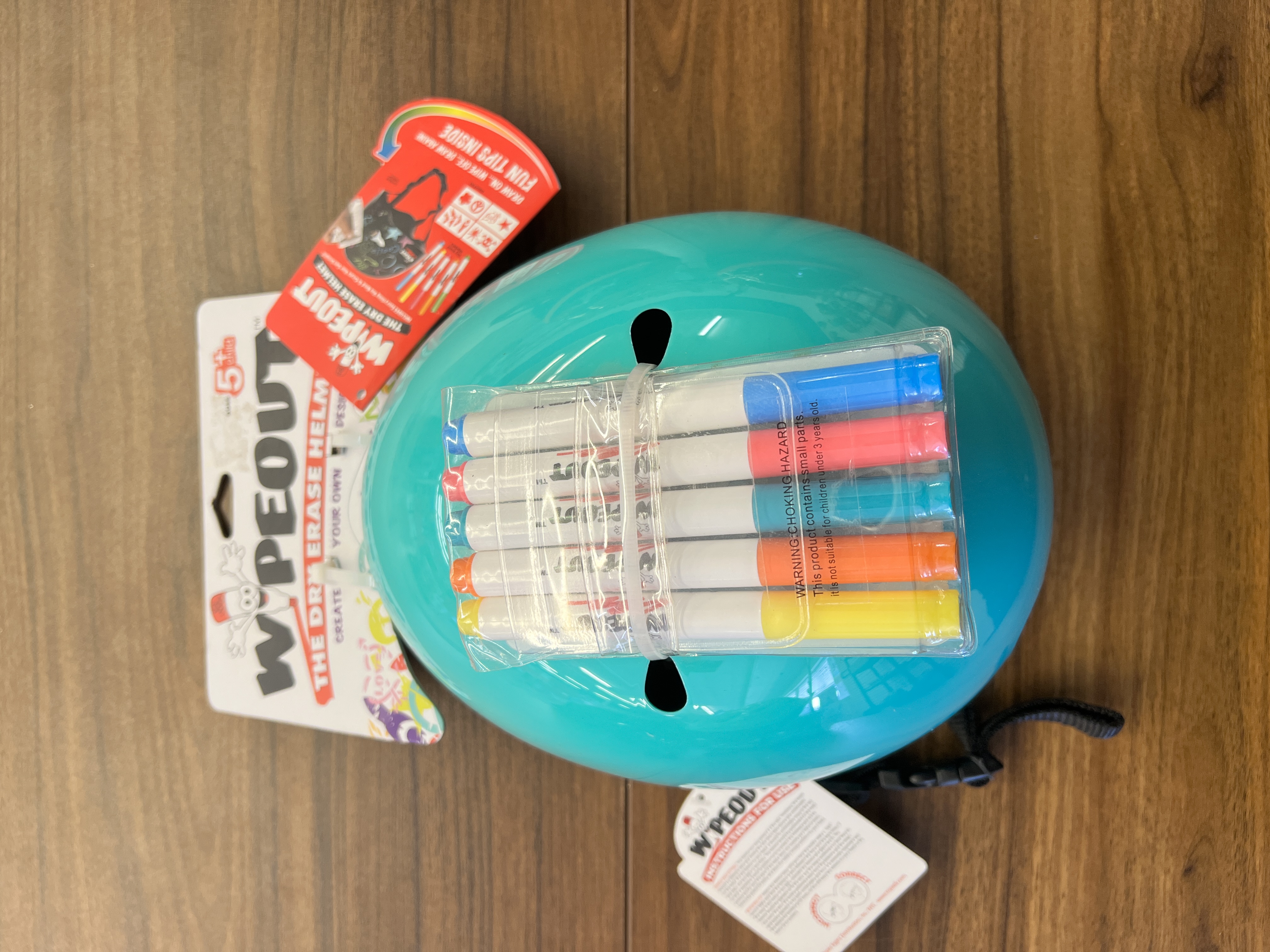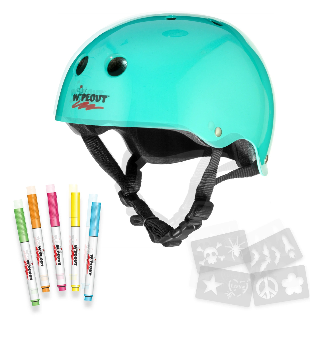 The Wipeout dry-erase kid's bike, skate, and scooter helmet make any child wearing it the envy of the neighborhood. Unlike traditional helmets, the Wipeout encourages kids to assert their individuality by creating and customizing their own inspired designs on the surface of the dry erase helmet. Each helmet includes five non-toxic dry erase markers in assorted neon colors, as well as a stencil kit with eight awesome shapes so kids can make an art project of their helmet before heading out on any kind of roller sports equipment, including bikes, roller skates, skateboards, and scooters. When it's time to come home, the helmet can be erased and a new design created for the next day of play. The Wipeout dry-erase kid's bike, skate, and scooter helmet features abs hard-shell for safety and durability and is dual certified for bike and skate use, complying with the U.S.