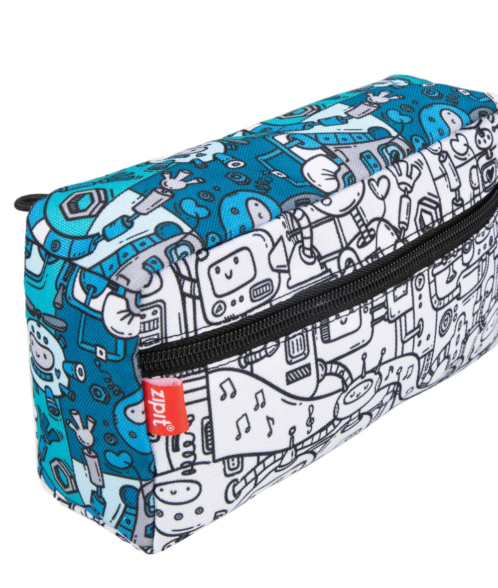 This artistic color in pencil pouch is designed to encourage creative individualism. At 8.3"x4.3"x2.6" it comfortably fits arts and crafts gear or school stationery. The intricate robot pattern comes partially colored in, and the included color marker integrated in the zipper puller just calls out ‘get creative’! We know that the pouch you purchase will end up a unique product thanks to your artistic vision, a one-of-it’s-kind creation!